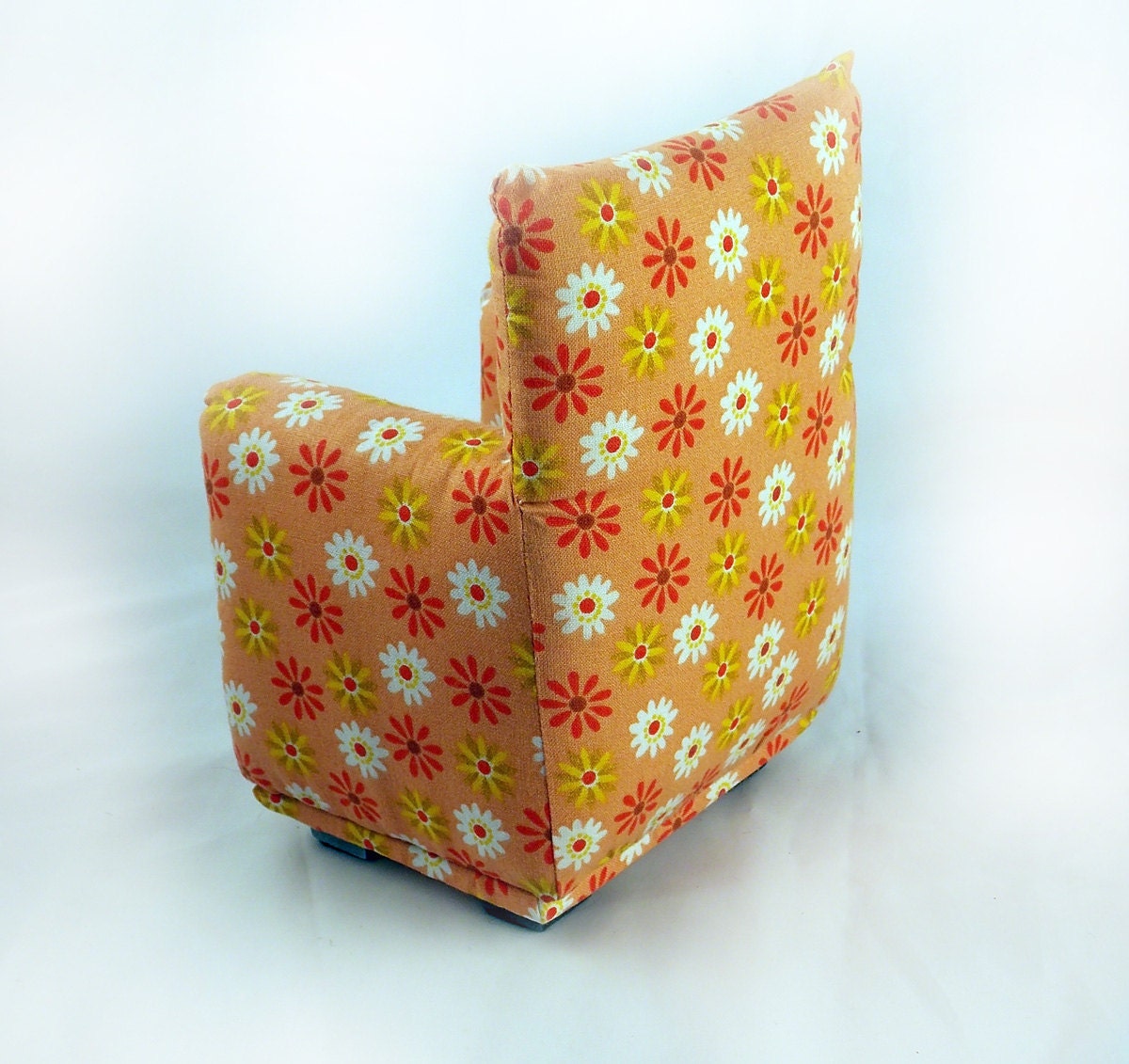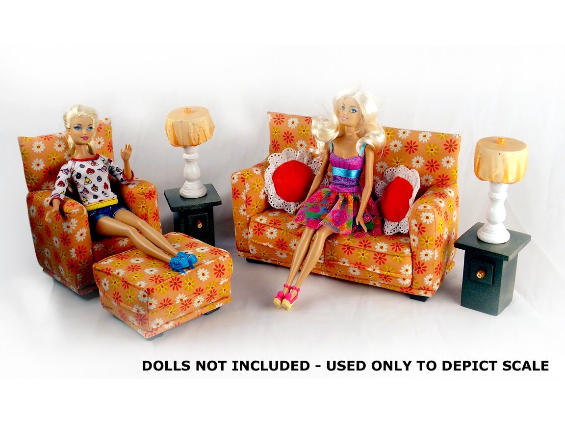 This Barbie doll furniture play set will provide years of usage for your special child. This set is handmade with sturdy wood frame construction. The Sofa, Chair and Ottoman are padded and covered with a warm playful colorful fabric. The covering for the furniture is machined sewn for added durability.