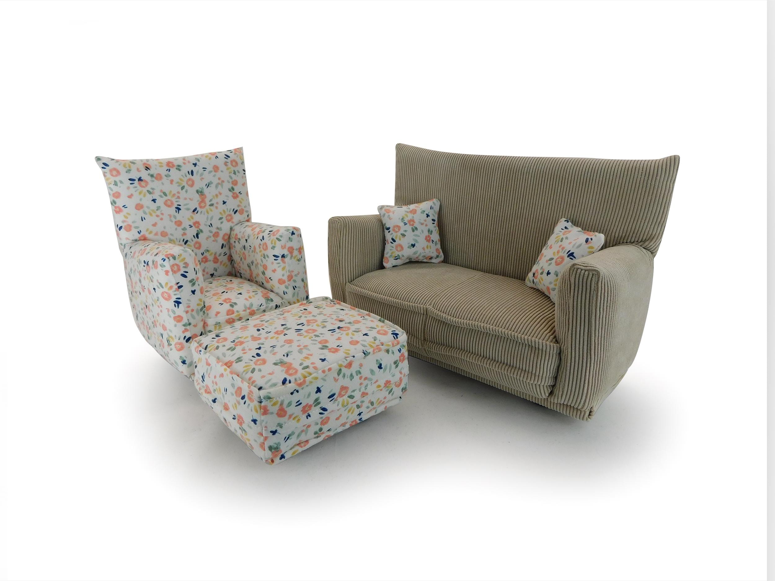 This set is handmade with sturdy wood frame construction. The Chair and Ottoman are padded and covered with White with tiny Pink and Green flower print (chair/ottoman) and Beige solid (sofa) fabric. Includes two matching pillows. This is a heavy-duty set made for normal pretend play, not a lightweight display set. This fashion doll furniture play set will provide years of usage for your special child.
