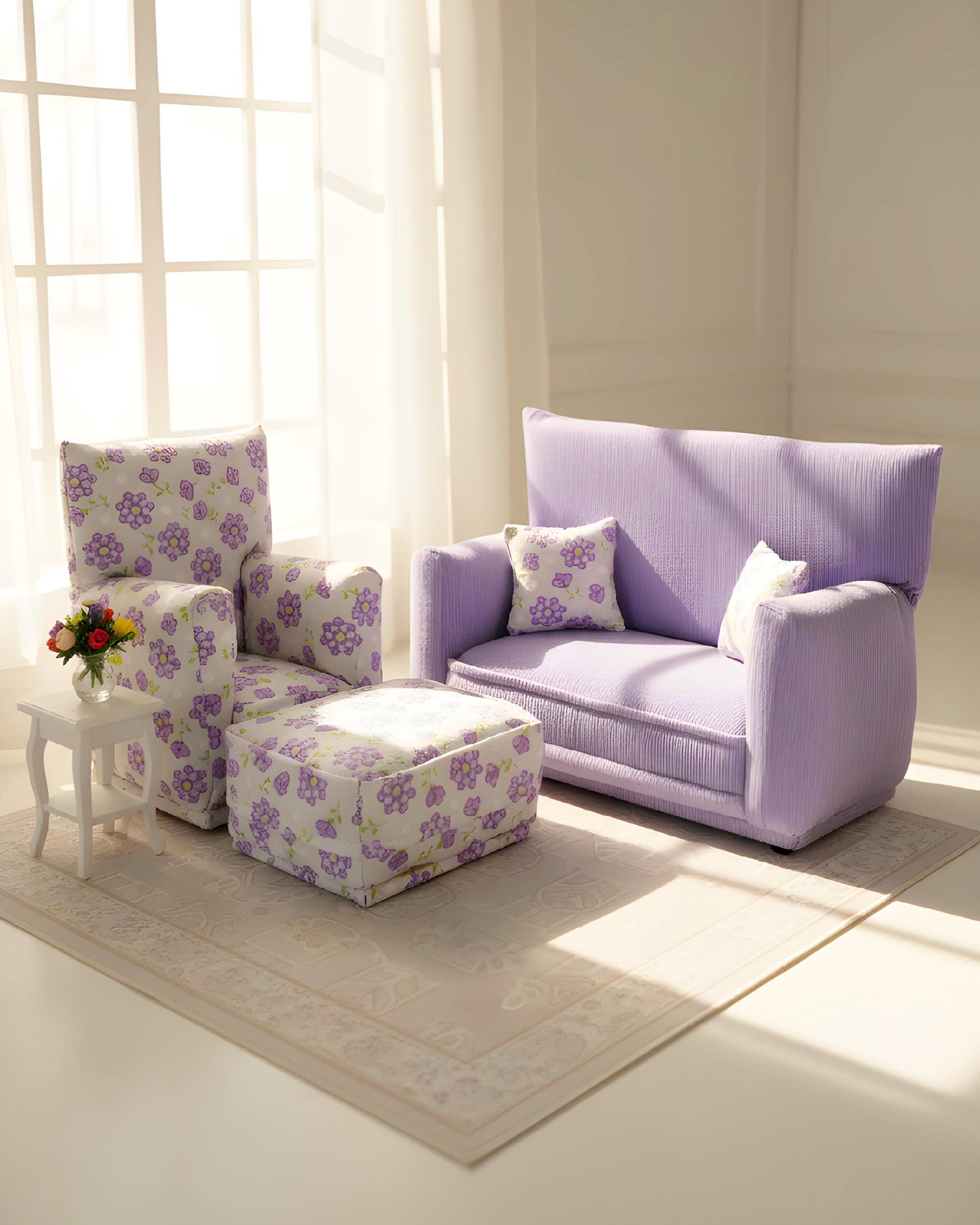 This set is handmade with sturdy wood frame construction. The Chair and Ottoman are padded and covered with White and Purple flower print (chair/ottoman) and Lavender solid (sofa) fabric. Includes two matching pillows. This is a heavy-duty set made for normal pretend play, not a lightweight display set. This fashion doll furniture play set will provide years of usage for your special child.