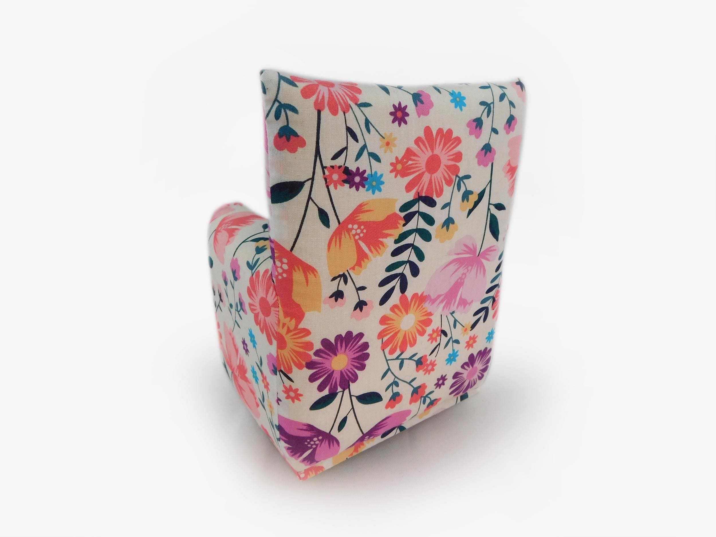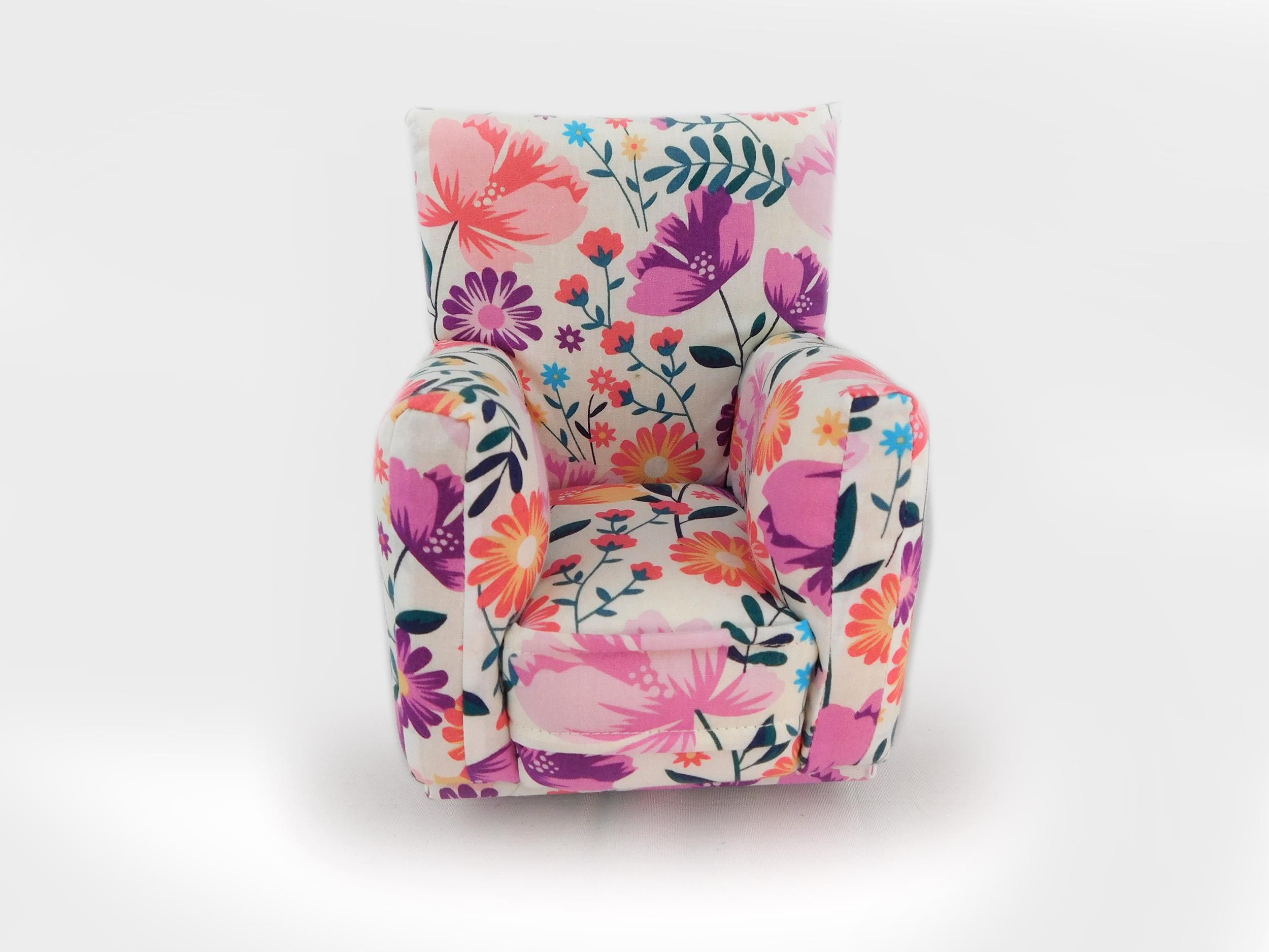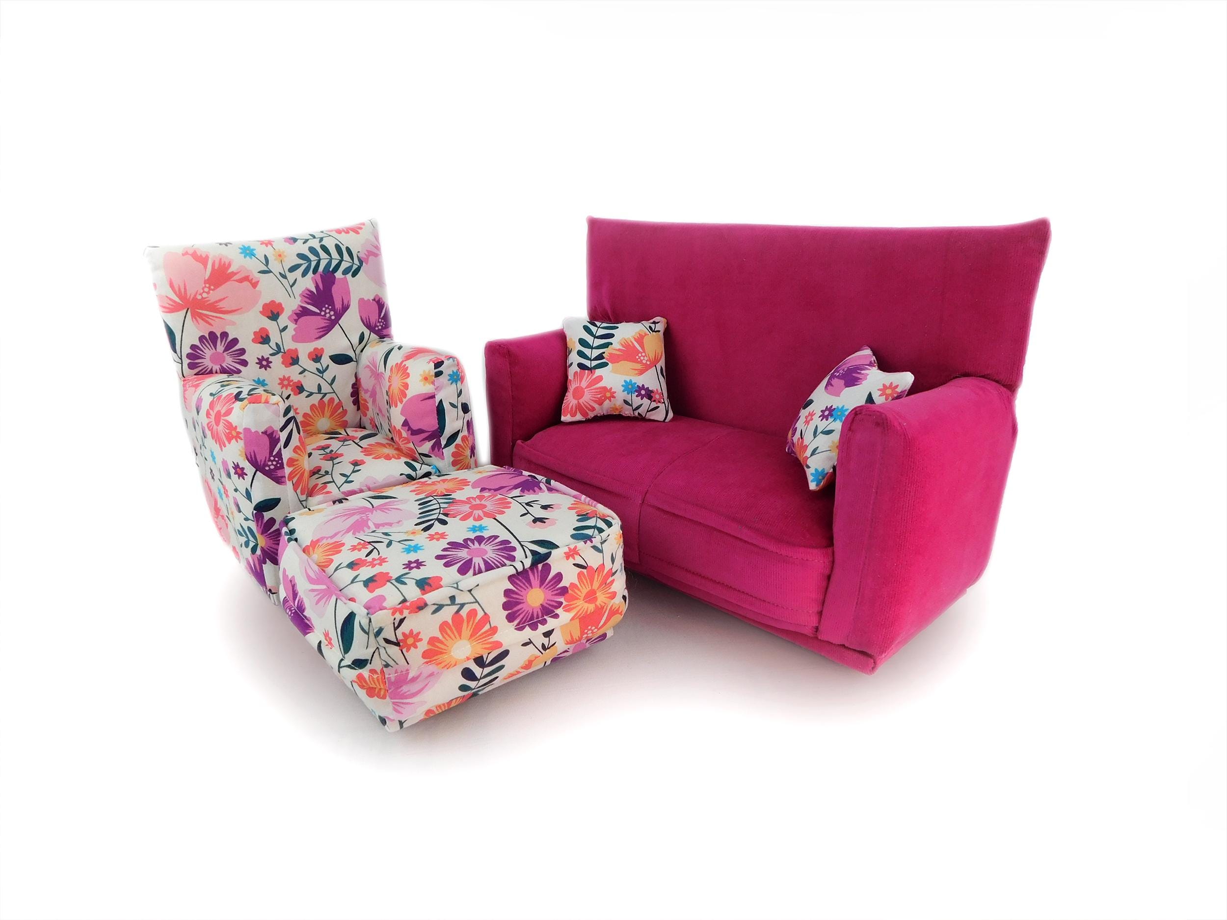 Perfect for 11" - 12" fashion dolls. This set is handmade with sturdy wood frame construction. The Chair and Ottoman are padded and covered with a White with Pink, Purple, Blue, Orange and Green flower print (chair/ottoman) and Hot Pink solid (sofa) fabric. Includes two matching pillows. This is a heavy-duty set made for normal pretend play, not a lightweight display set. This fashion doll furniture play set will provide years of usage for your special child.