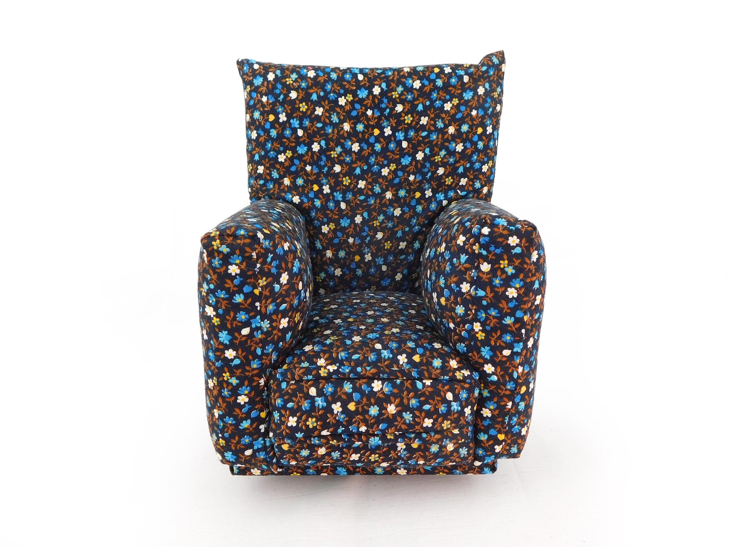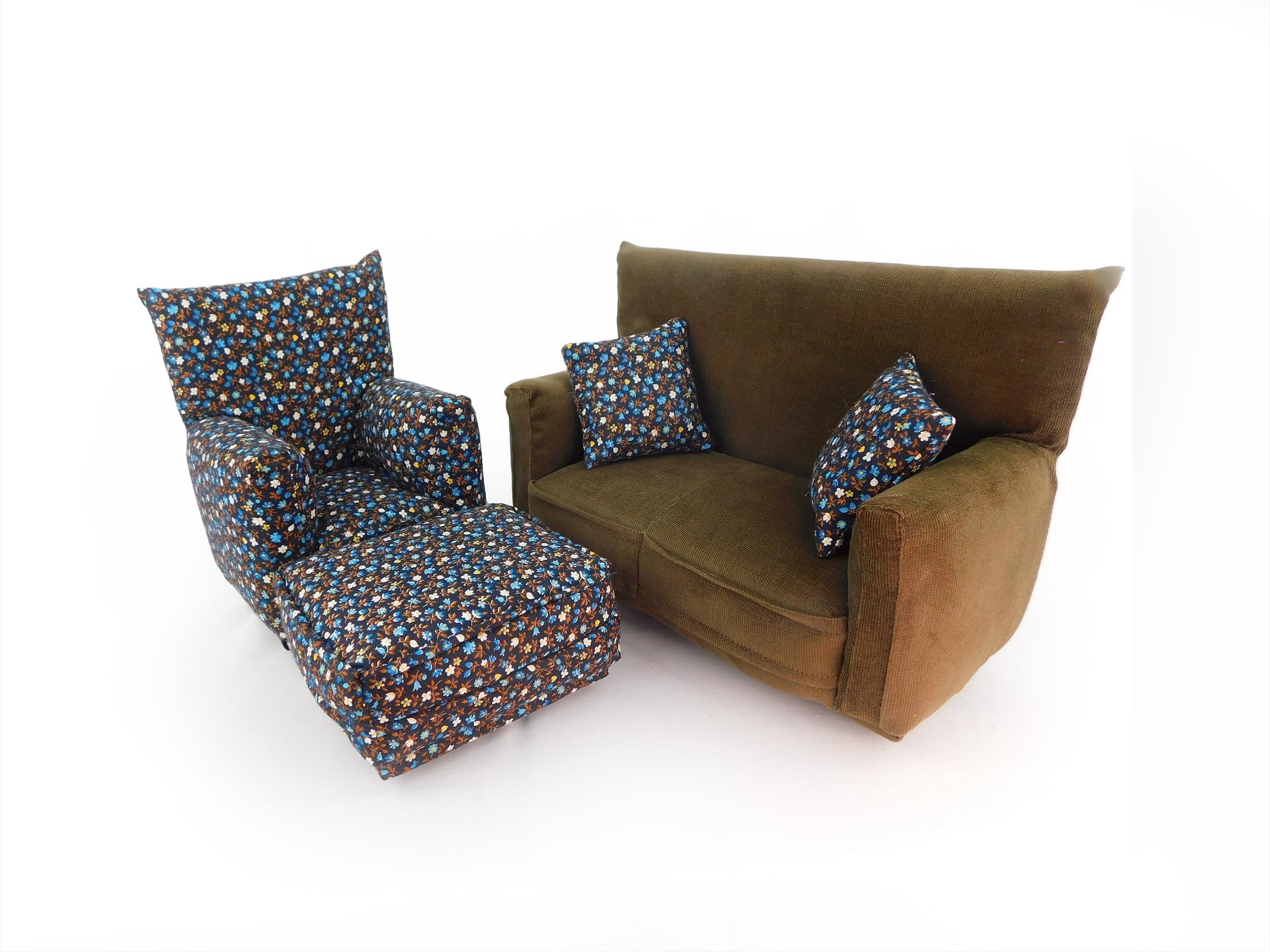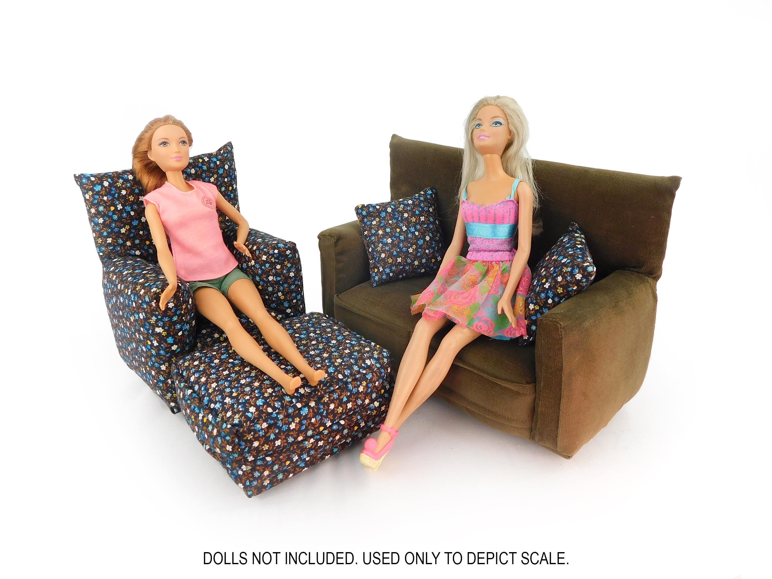 Perfect for 11" - 12" fashion dolls. This set is handmade with sturdy wood frame construction. The Chair and Ottoman are padded and covered with a Black with White, Blue, Brown, Tan tiny flower print (chair/ottoman) and Chocolate Brown solid (sofa) fabric. Includes two matching pillows. This is a heavy-duty set made for normal pretend play, not a lightweight display set. This fashion doll furniture play set will provide years of usage for your special child.