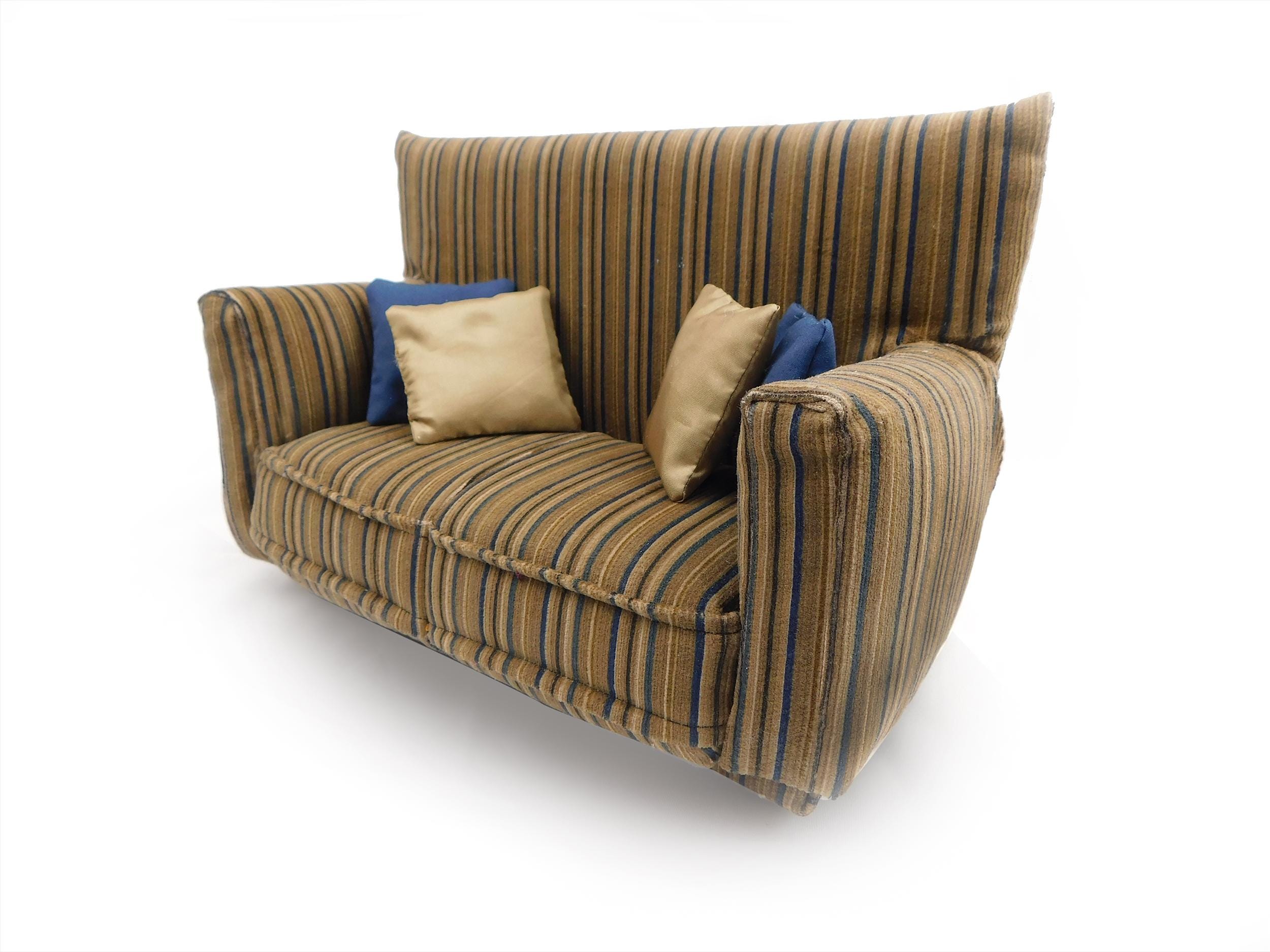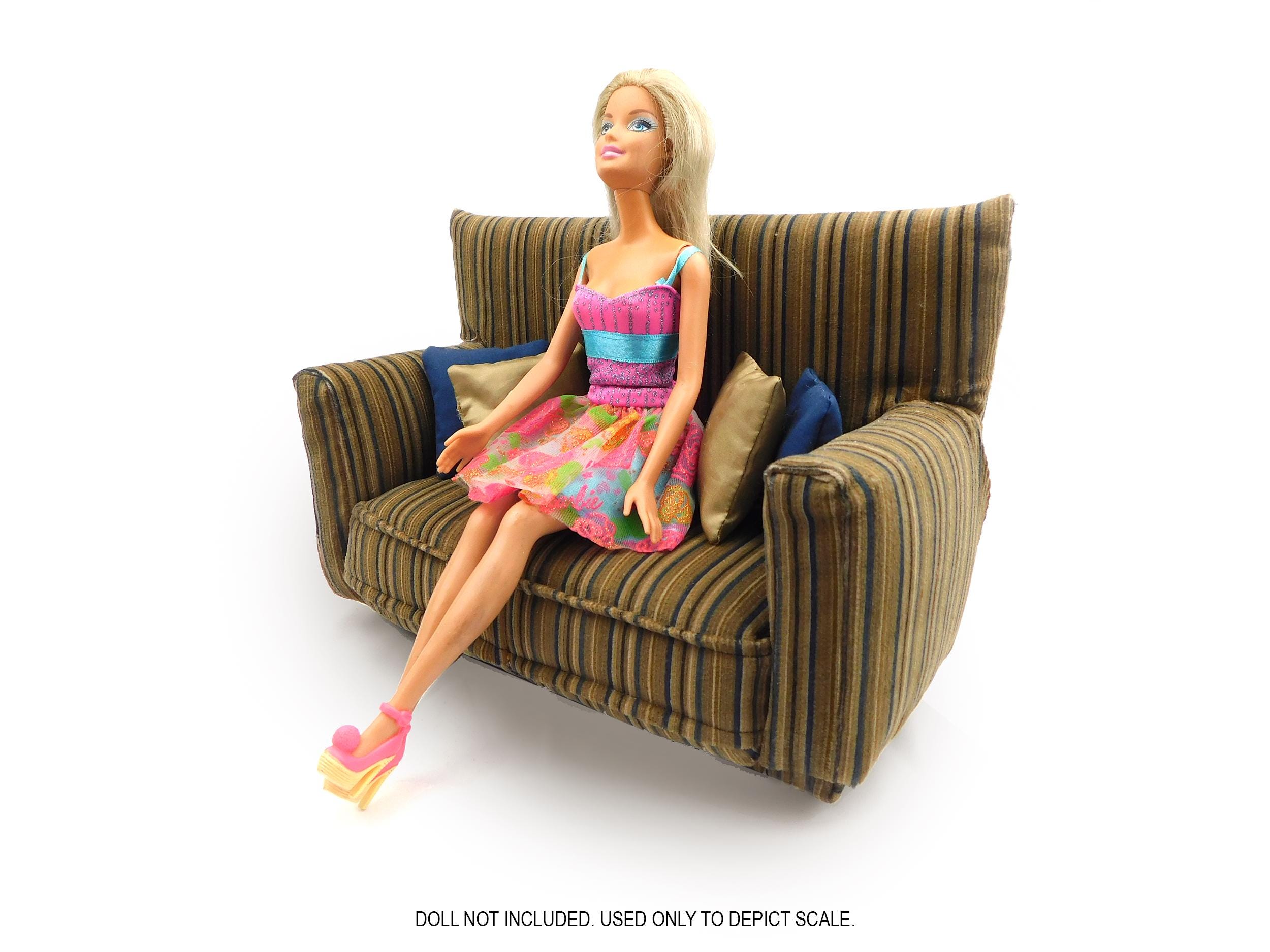 This set is handmade with sturdy wood frame construction. This fashion doll sofa furniture play set will provide years of usage for your special child. The Sofa is padded and covered with a Multi Brown striped fabric and includes four pillows.