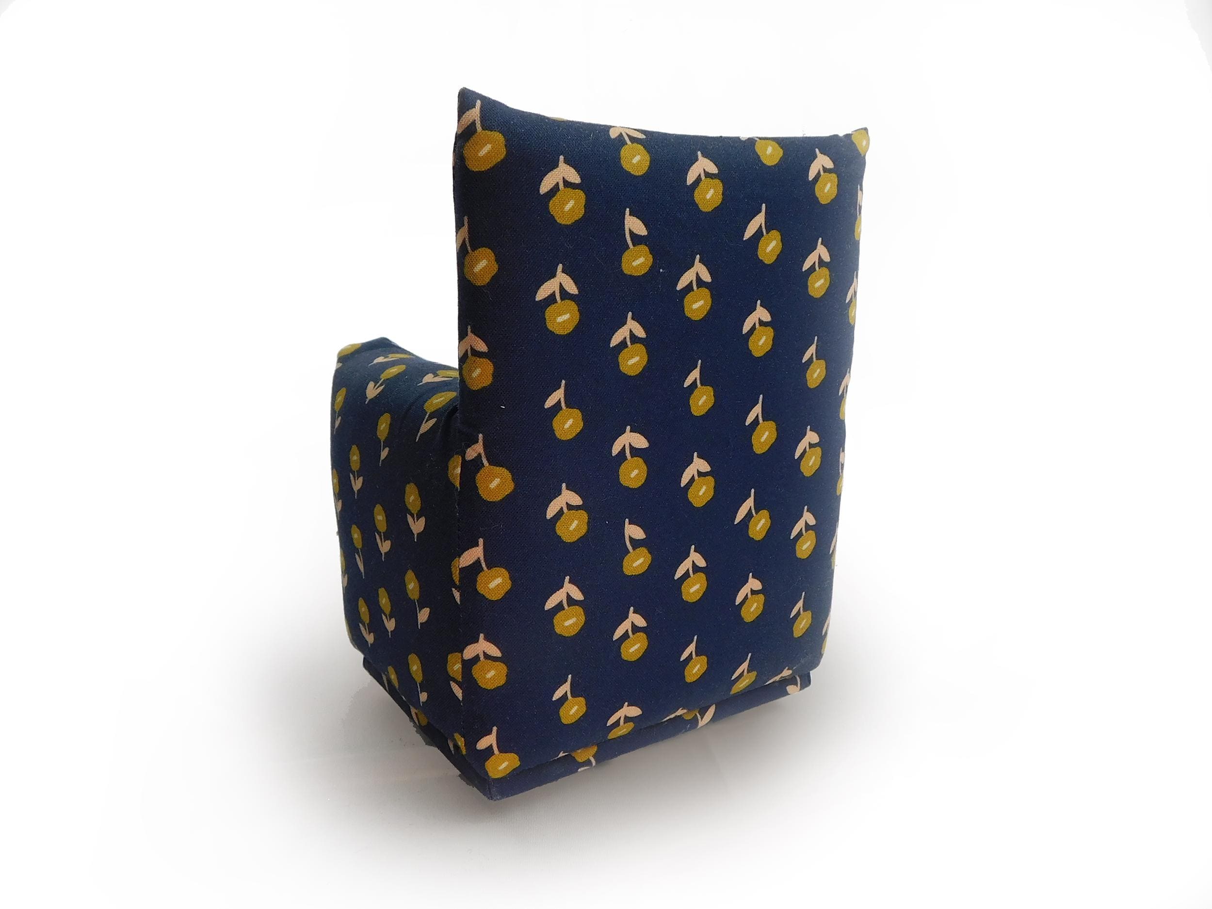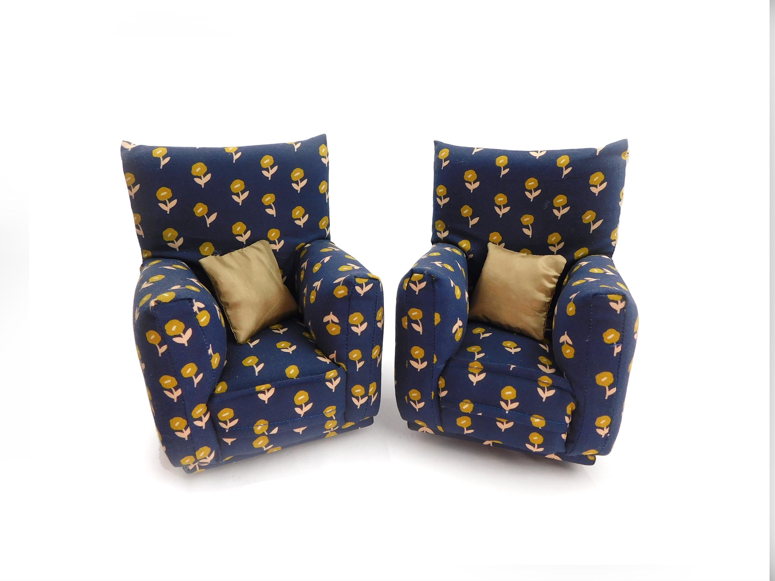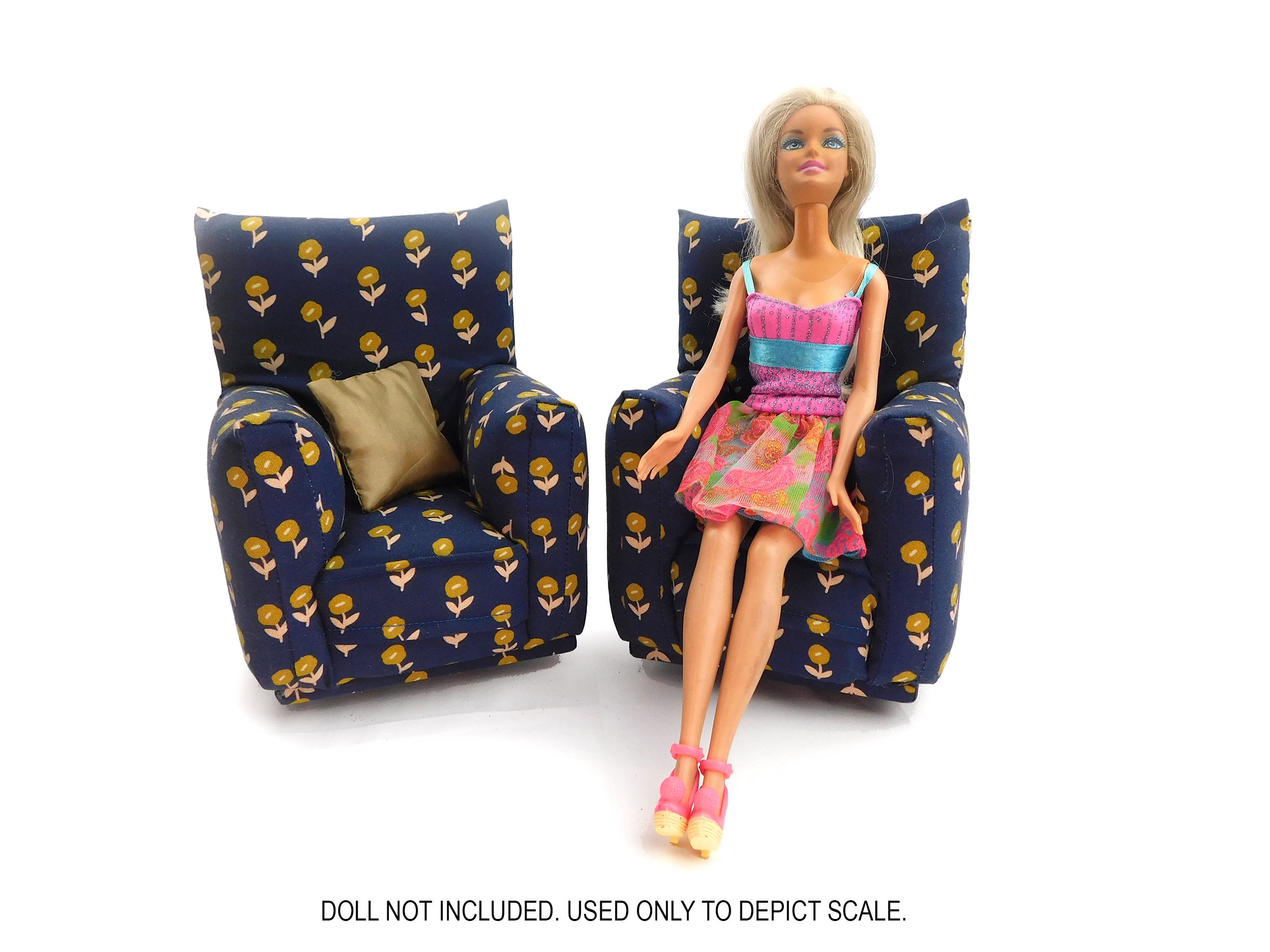 Perfect for 11" - 12" fashion dolls. This set is handmade with sturdy wood frame construction. The two chairs are padded and covered with a Navy Blue with Tan flower print fabric and includes two Tan pillows. This is a heavy-duty set made for normal pretend play, not a lightweight display set. This fashion doll furniture play set will provide years of usage for your special child.