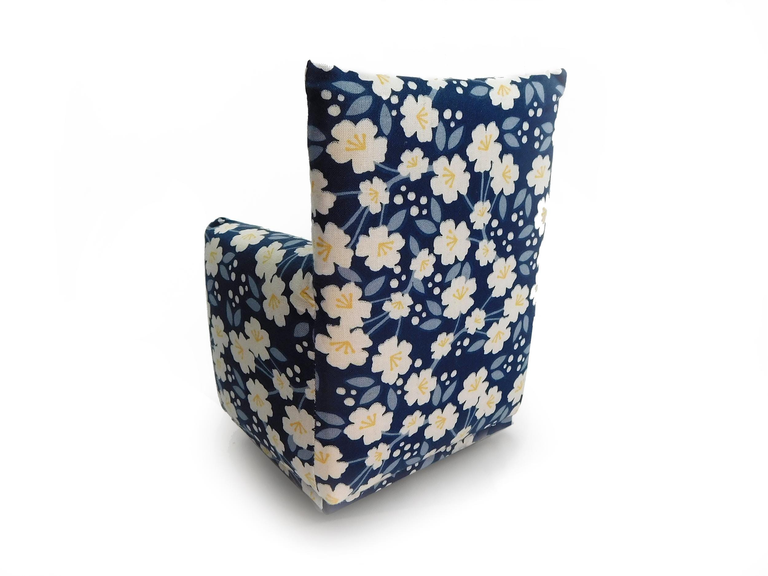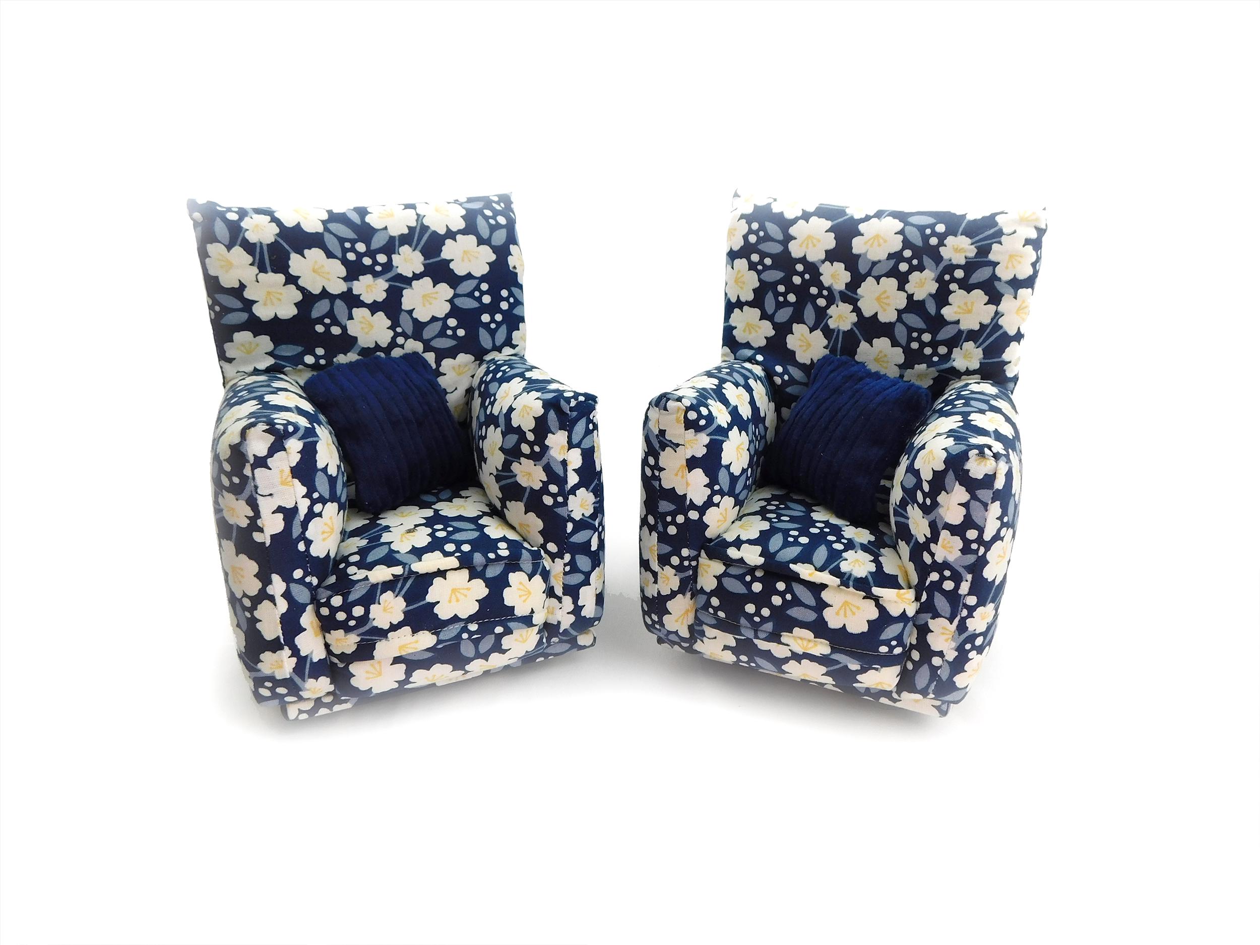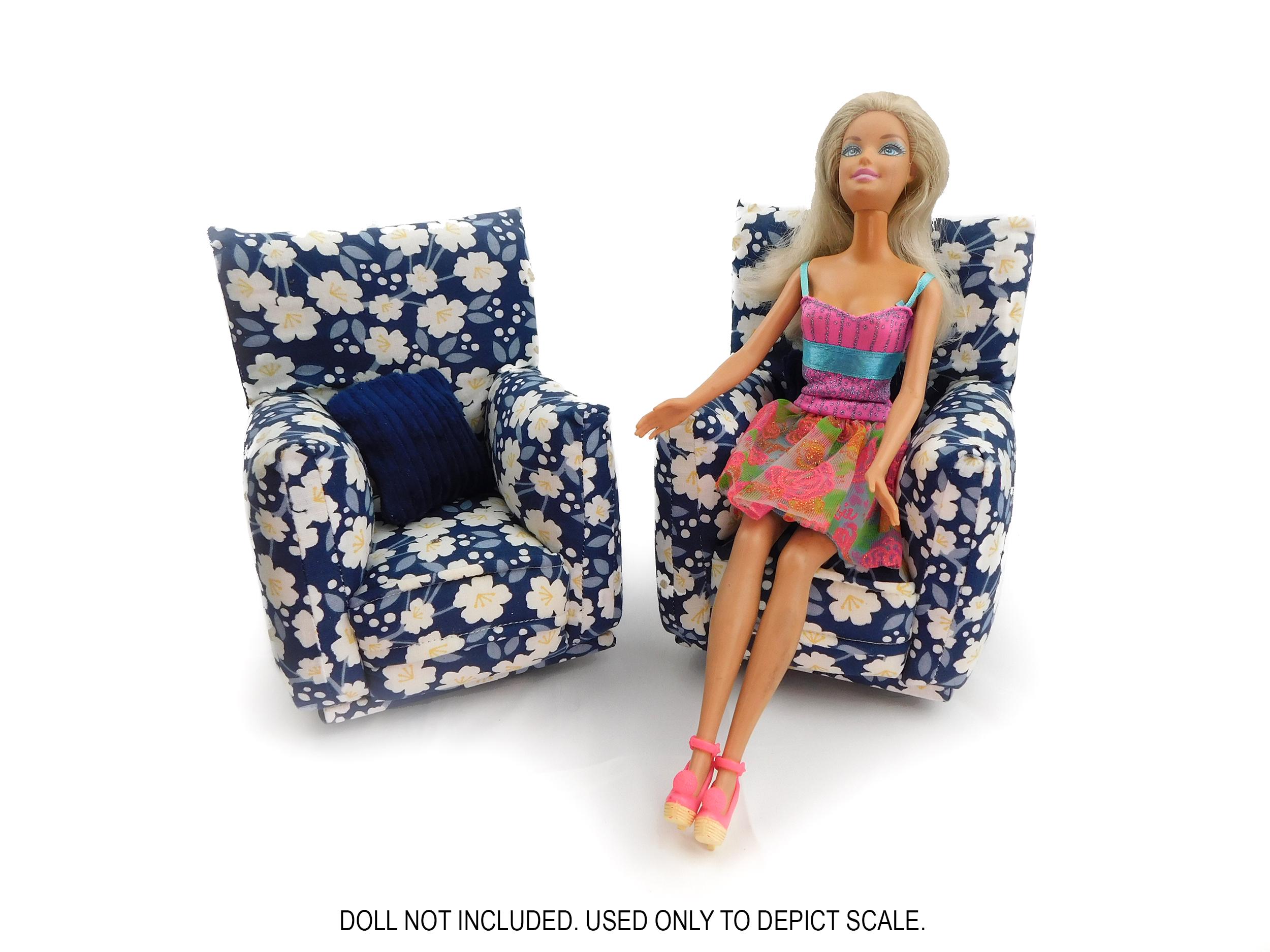 Perfect for 11" - 12" fashion dolls. This set is handmade with sturdy wood frame construction. The two chairs are padded and covered with a Dark Blue with Lighter Blue, White and Yellow flower print fabric and includes two Dark Blue pillows. This is a heavy-duty set made for normal pretend play, not a lightweight display set. This fashion doll furniture play set will provide years of usage for your special child.