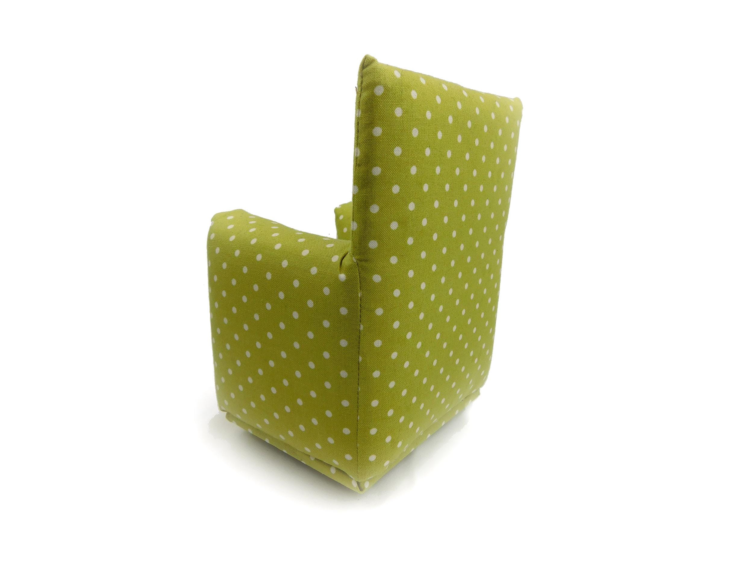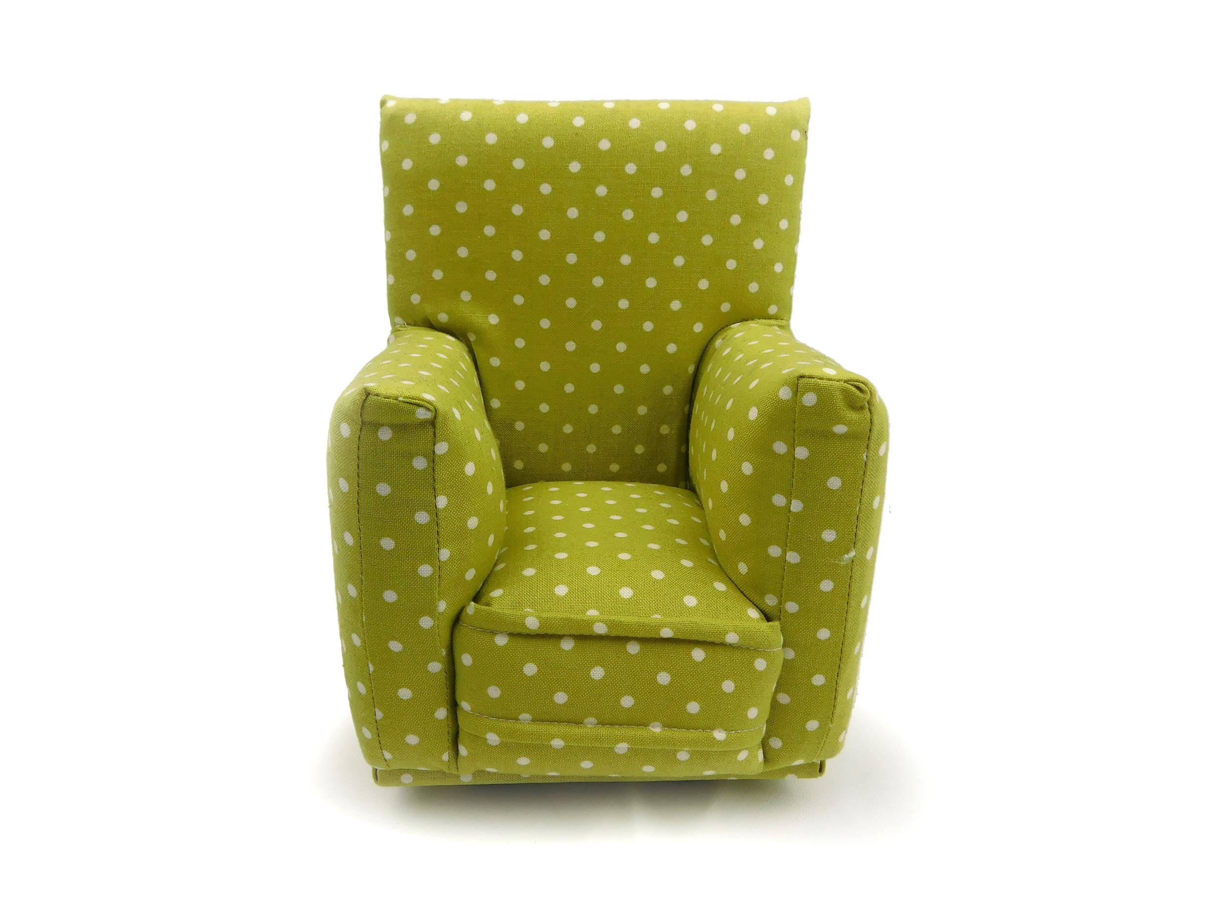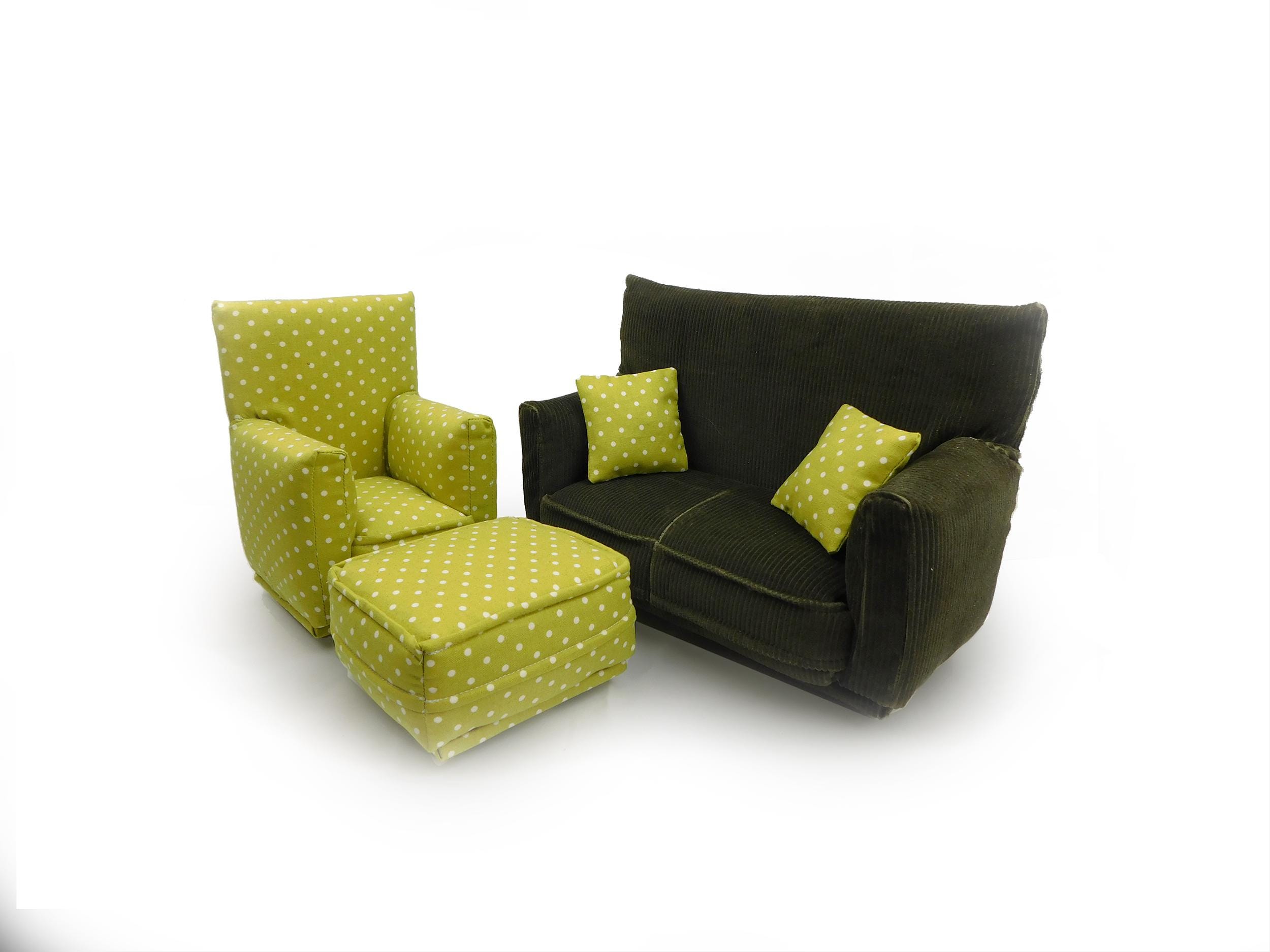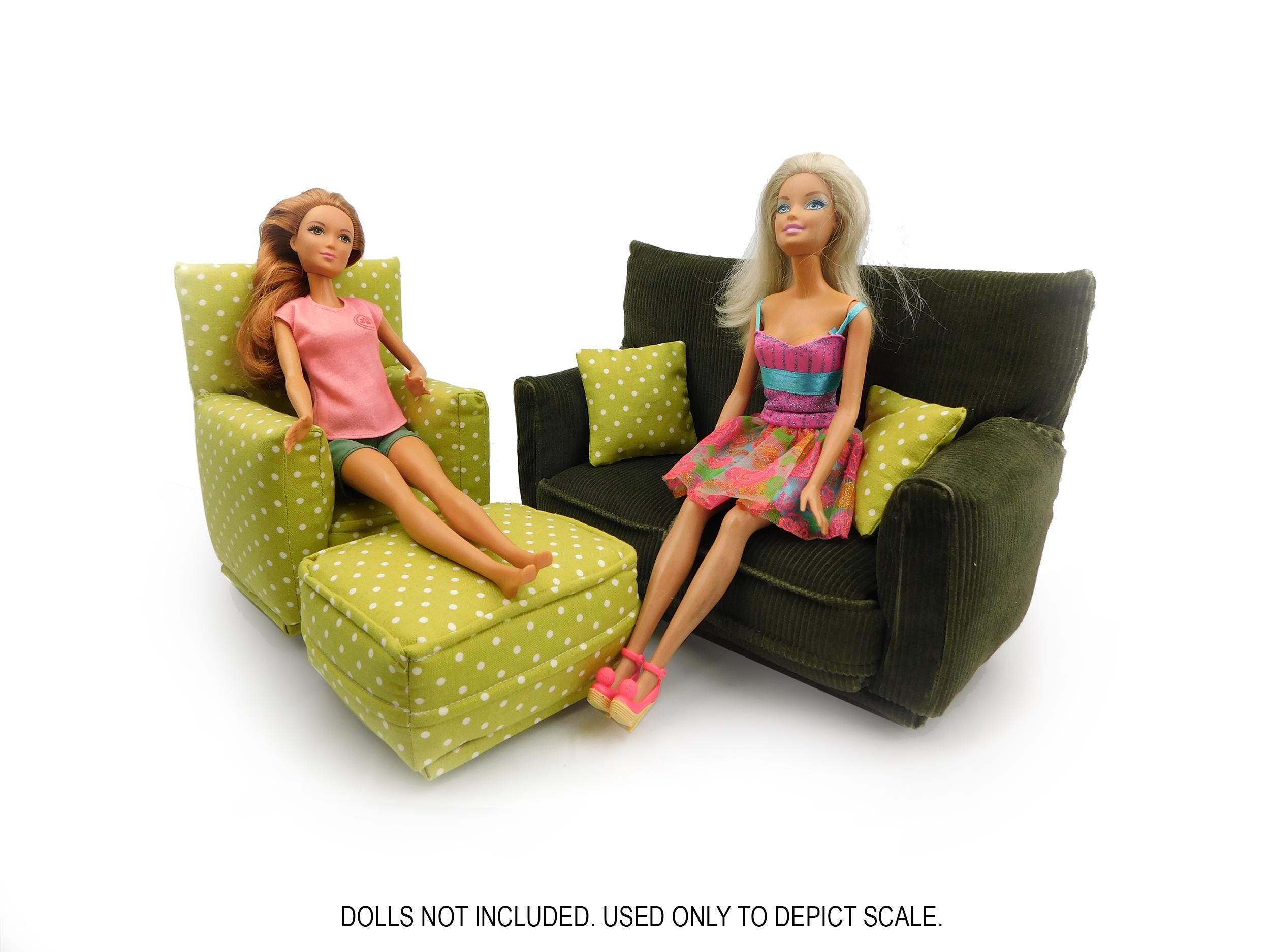 Perfect for 11" - 12" fashion dolls. This set is handmade with sturdy wood frame construction. The Chair and Ottoman are padded and covered with a Lime Green Polka Dot print (chair/ottoman) and Dark Olive Green solid (sofa) fabric. Includes two matching pillows. This is a heavy-duty set made for normal pretend play, not a lightweight display set. This fashion doll furniture play set will provide years of usage for your special child.