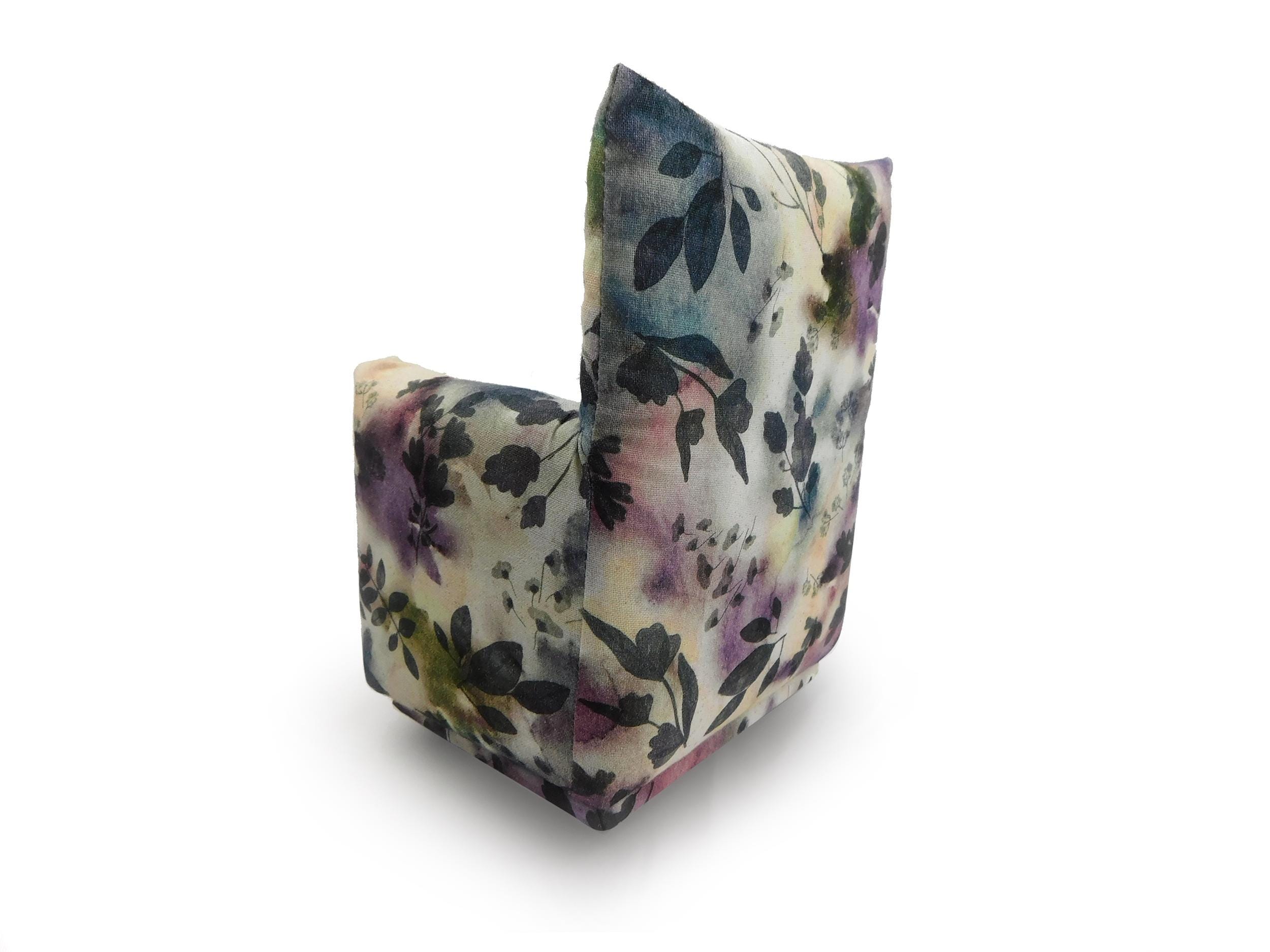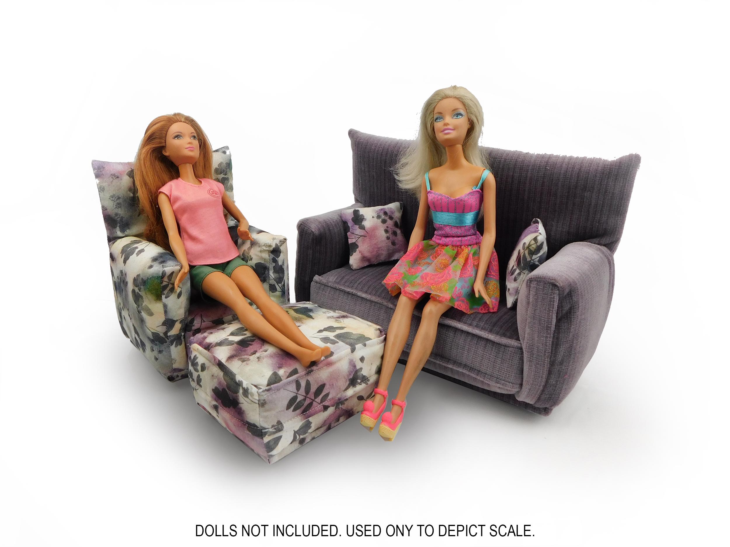 Perfect for 11" - 12" fashion dolls. This set is handmade with sturdy wood frame construction. The Chair and Ottoman are padded and covered with a White with Purple, Green and Grey watercolor flower print (chair/ottoman) and Frosted Purple solid (sofa) fabric. Includes two matching pillows. This is a heavy-duty set made for normal pretend play, not a lightweight display set. This fashion doll furniture play set will provide years of usage for your special child.