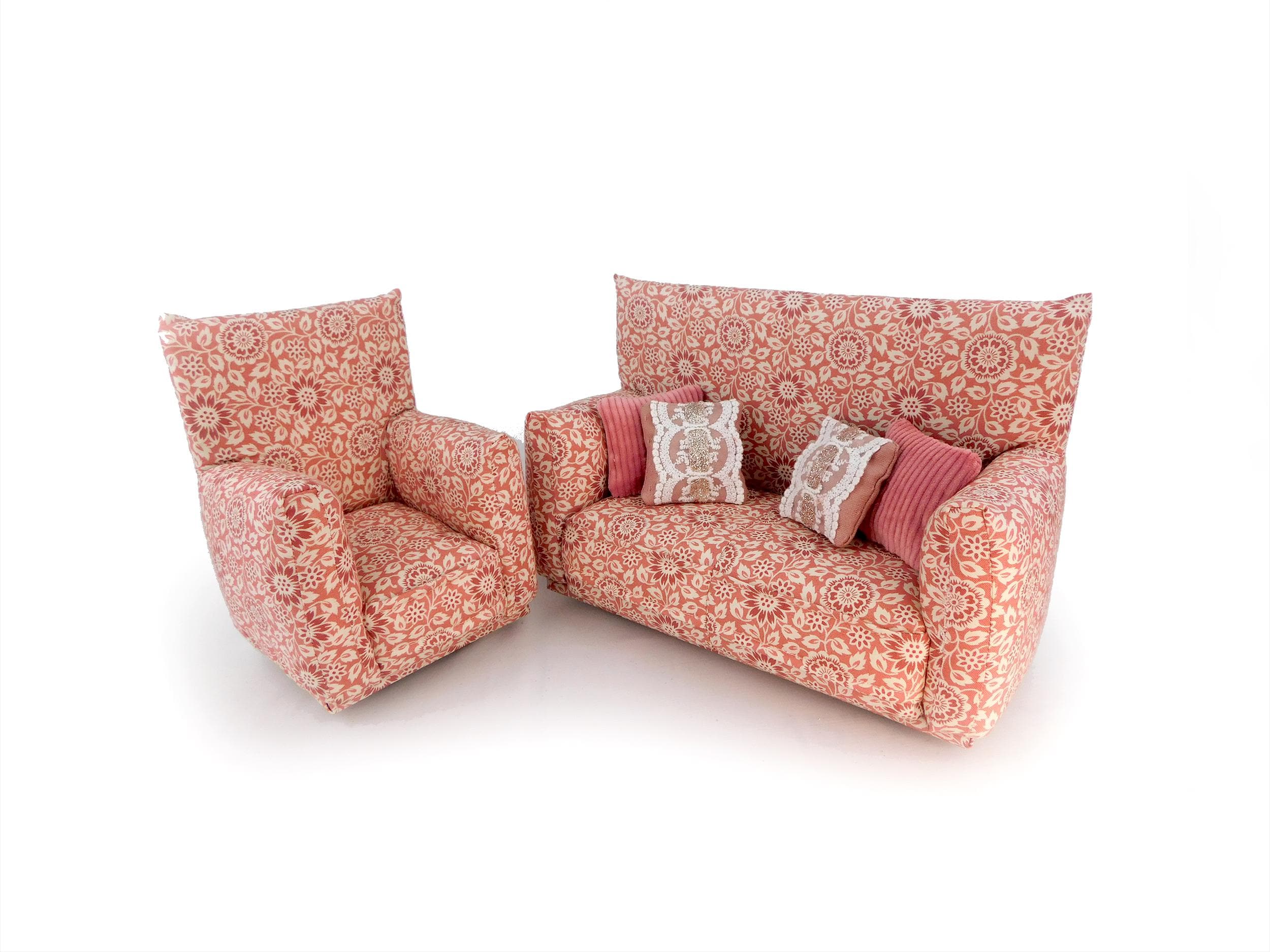 Perfect for 11" - 12" fashion dolls. This set is handmade with sturdy wood frame construction. The Chair and Sofa is padded and covered with a Pink with White flower print fabric. Includes four coordinating pillows. This is a heavy-duty set made for normal pretend play, not a lightweight display set. This fashion doll furniture play set will provide years of usage for your special child.
