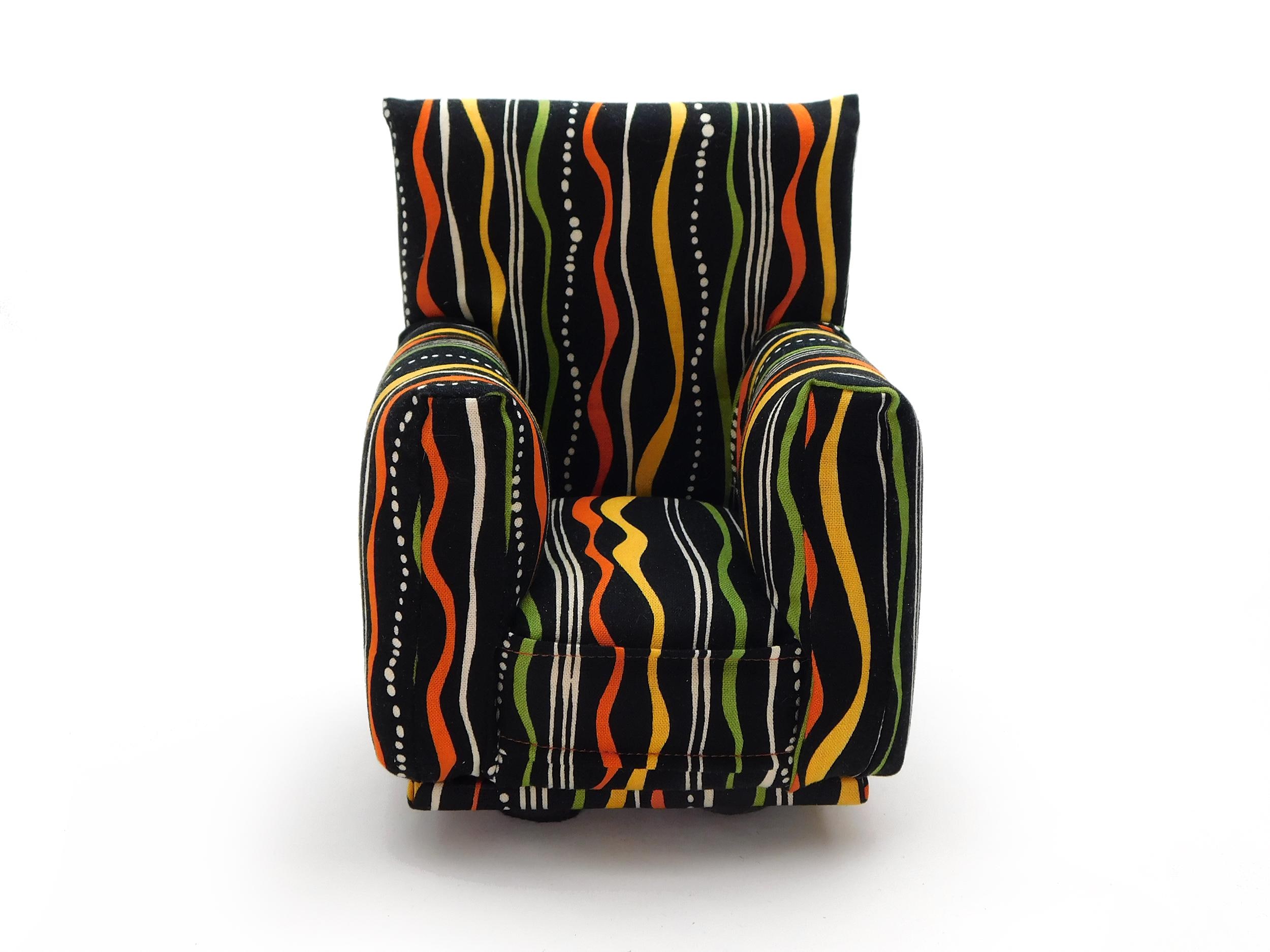 Perfect for 11" - 12" fashion dolls. This set is handmade with sturdy wood frame construction. The Chair and Ottoman are padded and covered with a Black with Yellow, Orange, Green and White Geo print (chair/ottoman) and Yellow solid (sofa) fabric. Includes two matching pillows. This is a heavy-duty set made for normal pretend play, not a lightweight display set. This fashion doll furniture play set will provide years of usage for your special child.