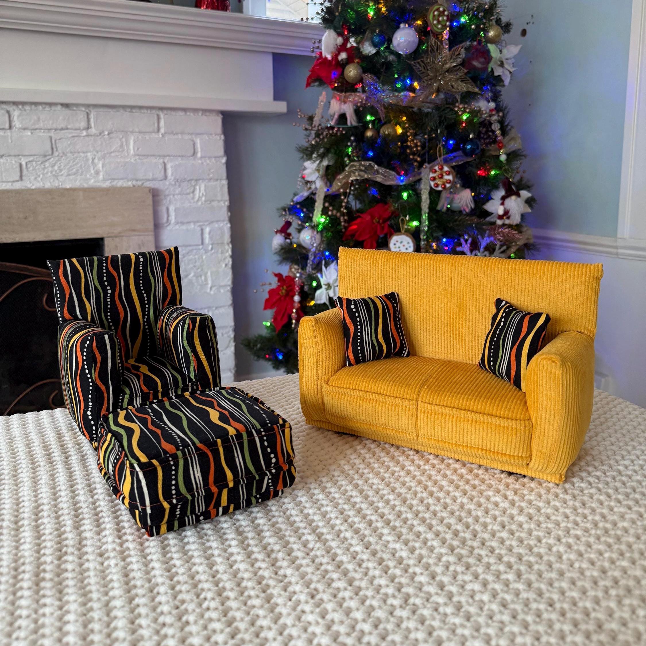 Perfect for 11" - 12" fashion dolls. This set is handmade with sturdy wood frame construction. The Chair and Ottoman are padded and covered with a Black with Yellow, Orange, Green and White Geo print (chair/ottoman) and Yellow solid (sofa) fabric. Includes two matching pillows. This is a heavy-duty set made for normal pretend play, not a lightweight display set. This fashion doll furniture play set will provide years of usage for your special child.