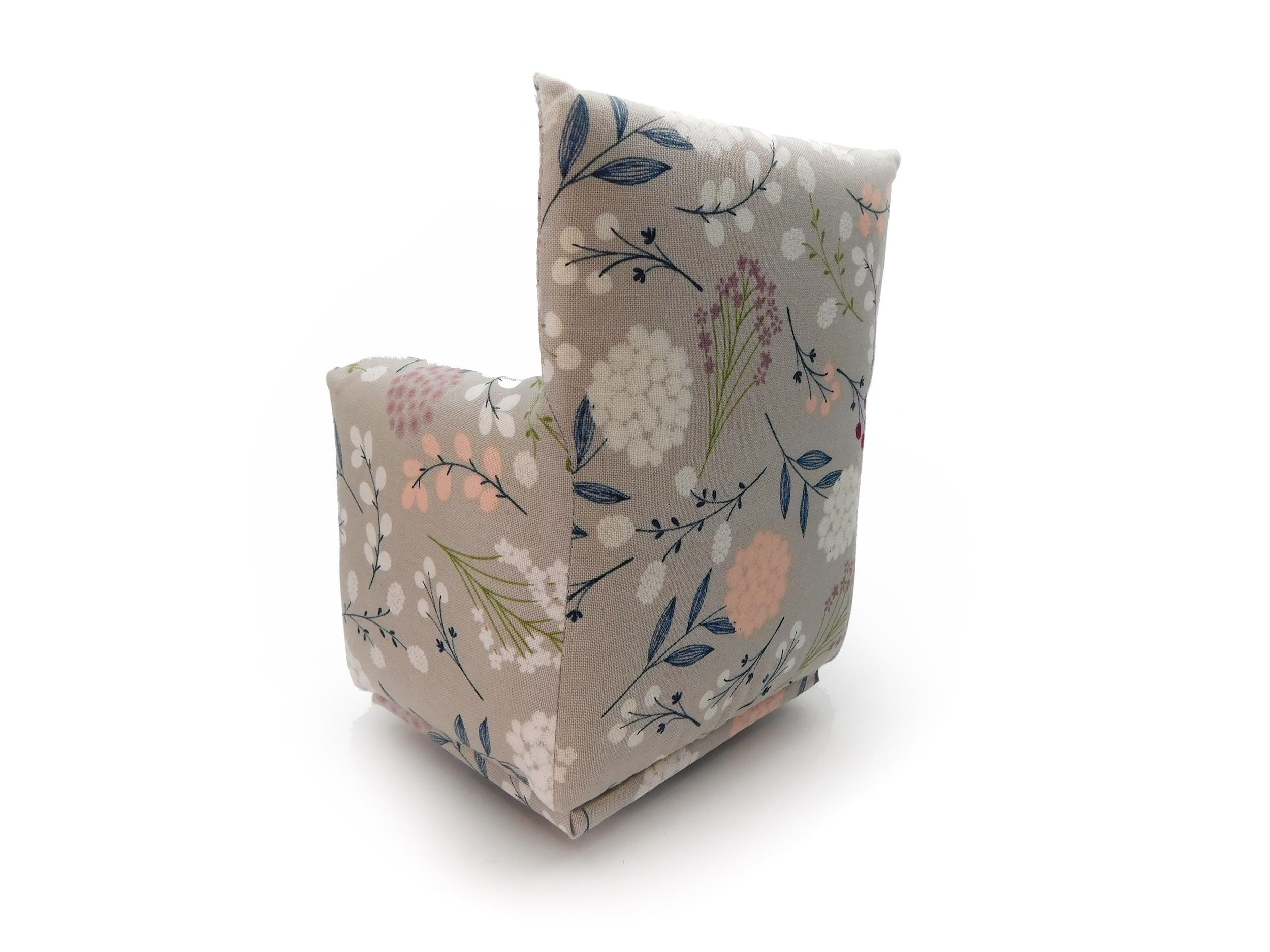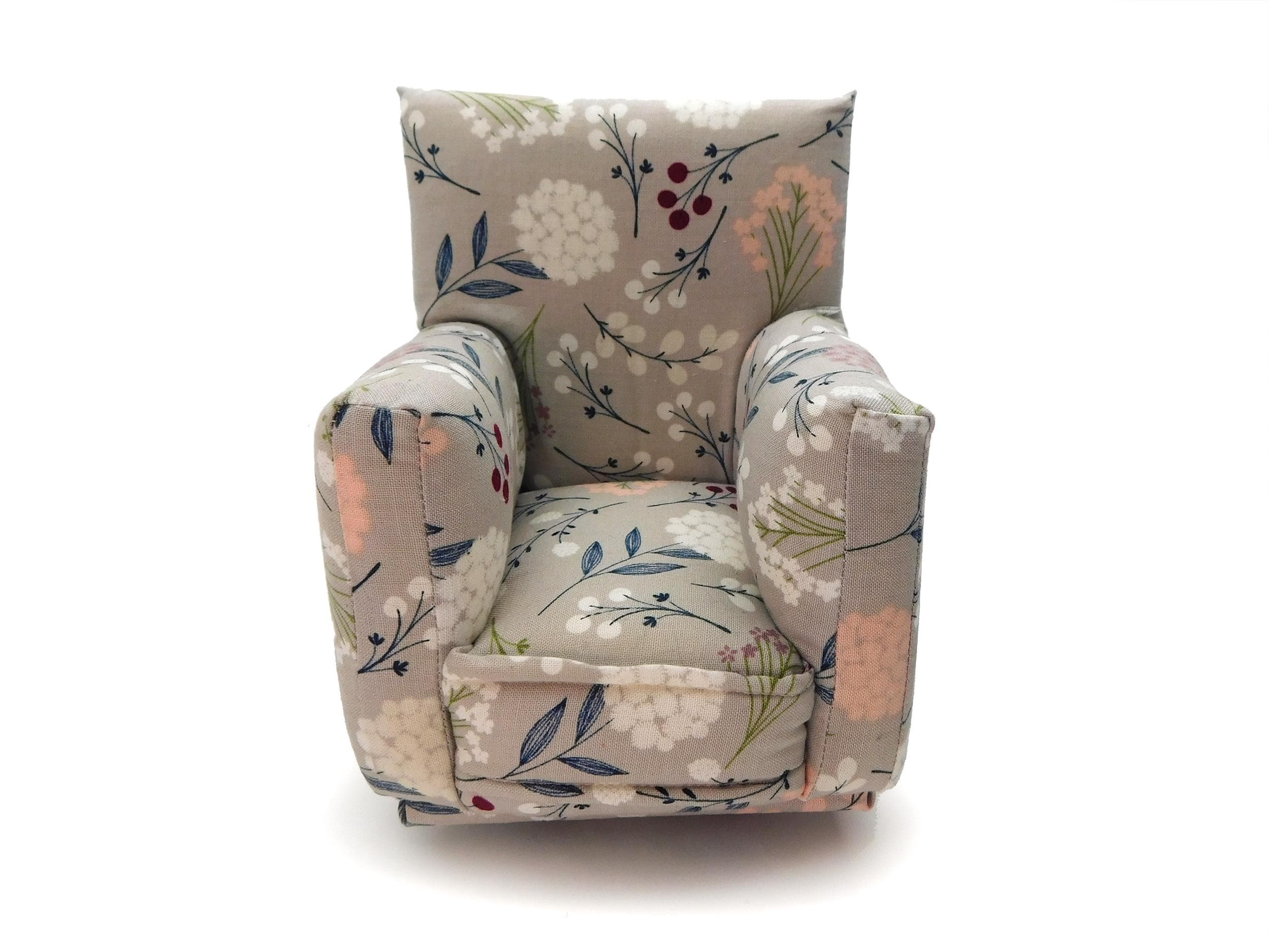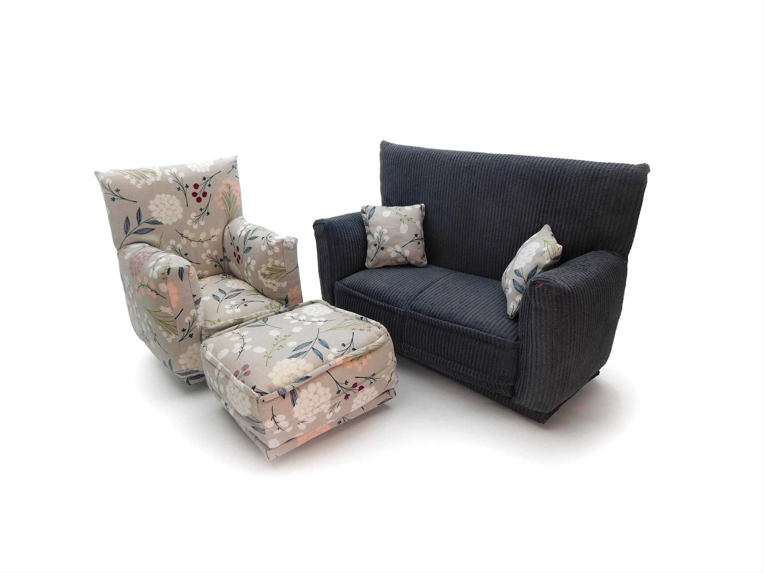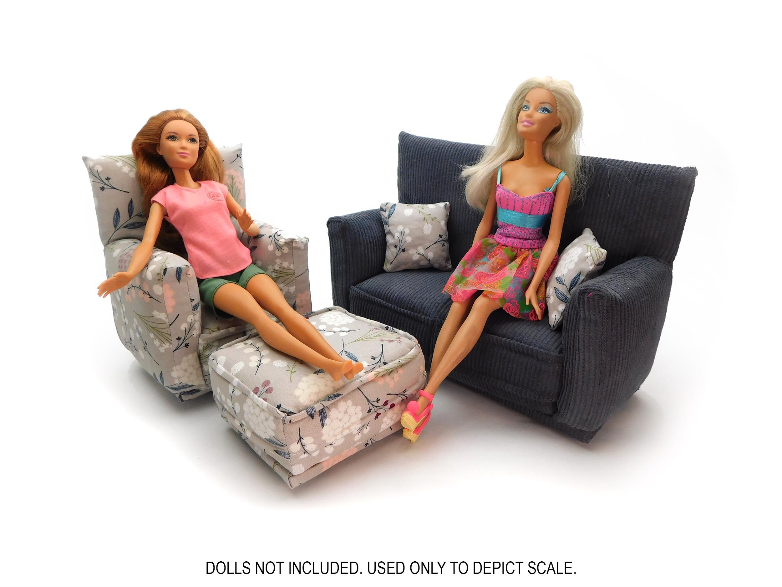 Perfect for 11" - 12" fashion dolls. This set is handmade with sturdy wood frame construction. The Chair and Ottoman are padded and covered with a Light Gray with White, Pink and Green flower print (chair/ottoman) and