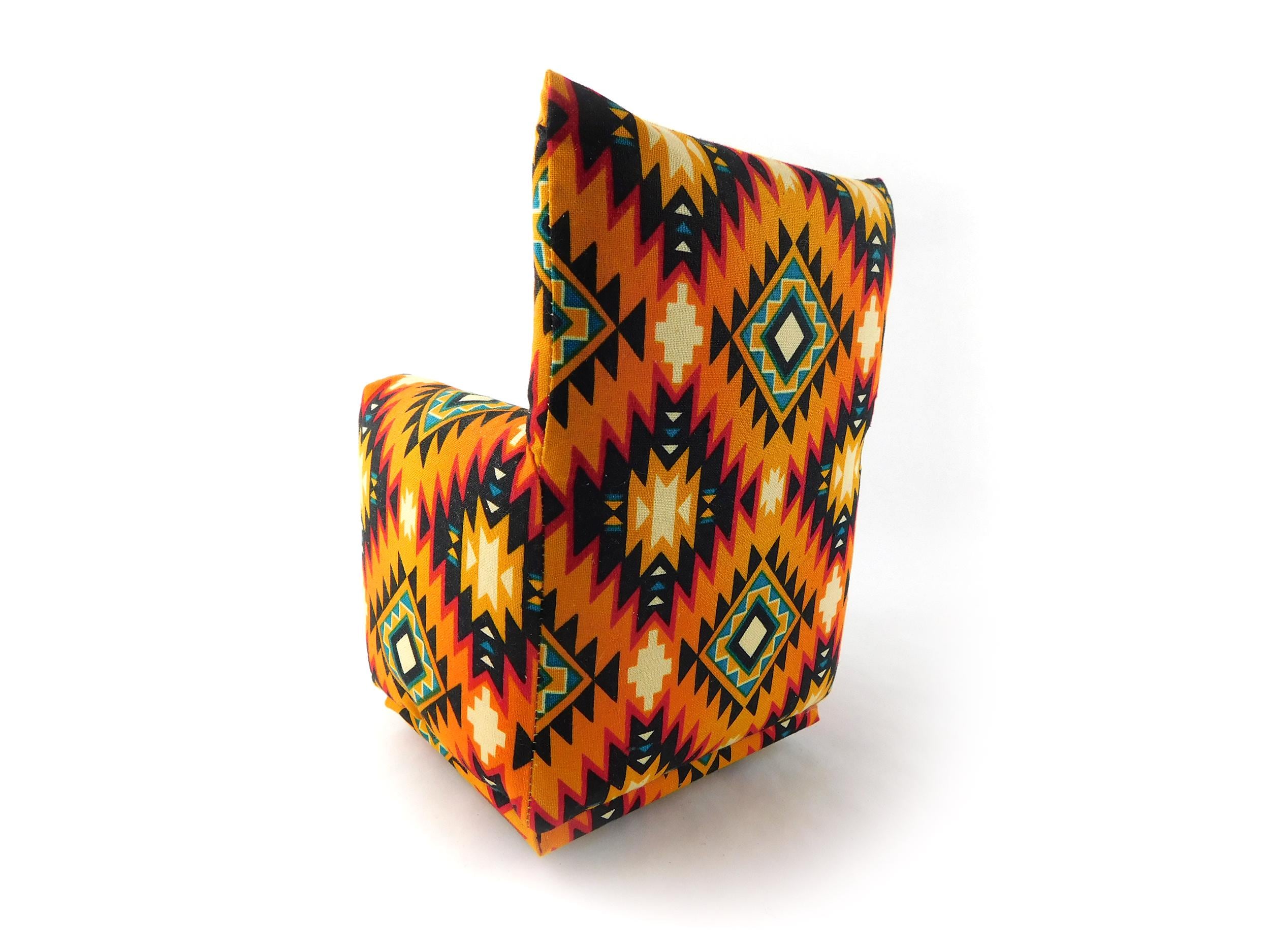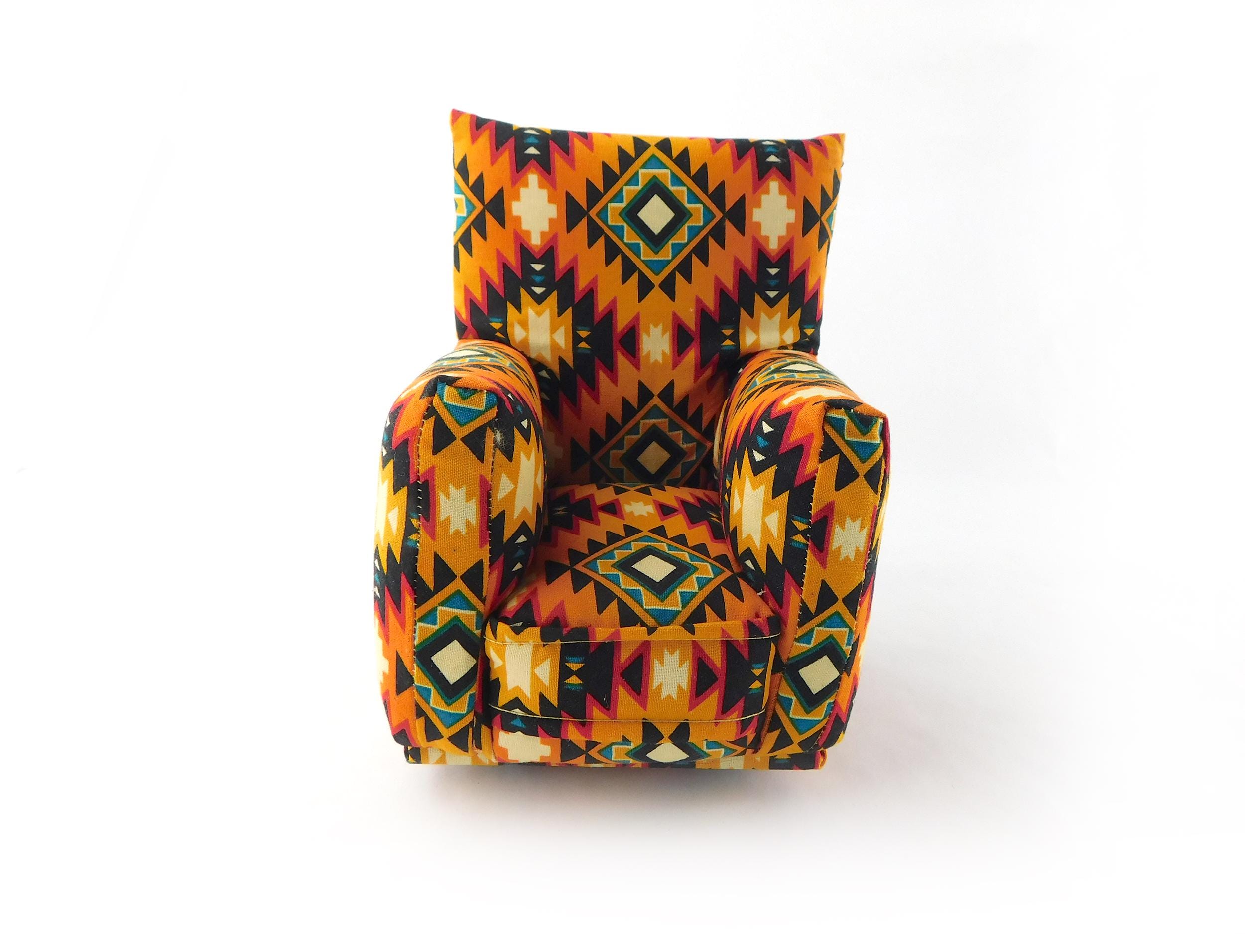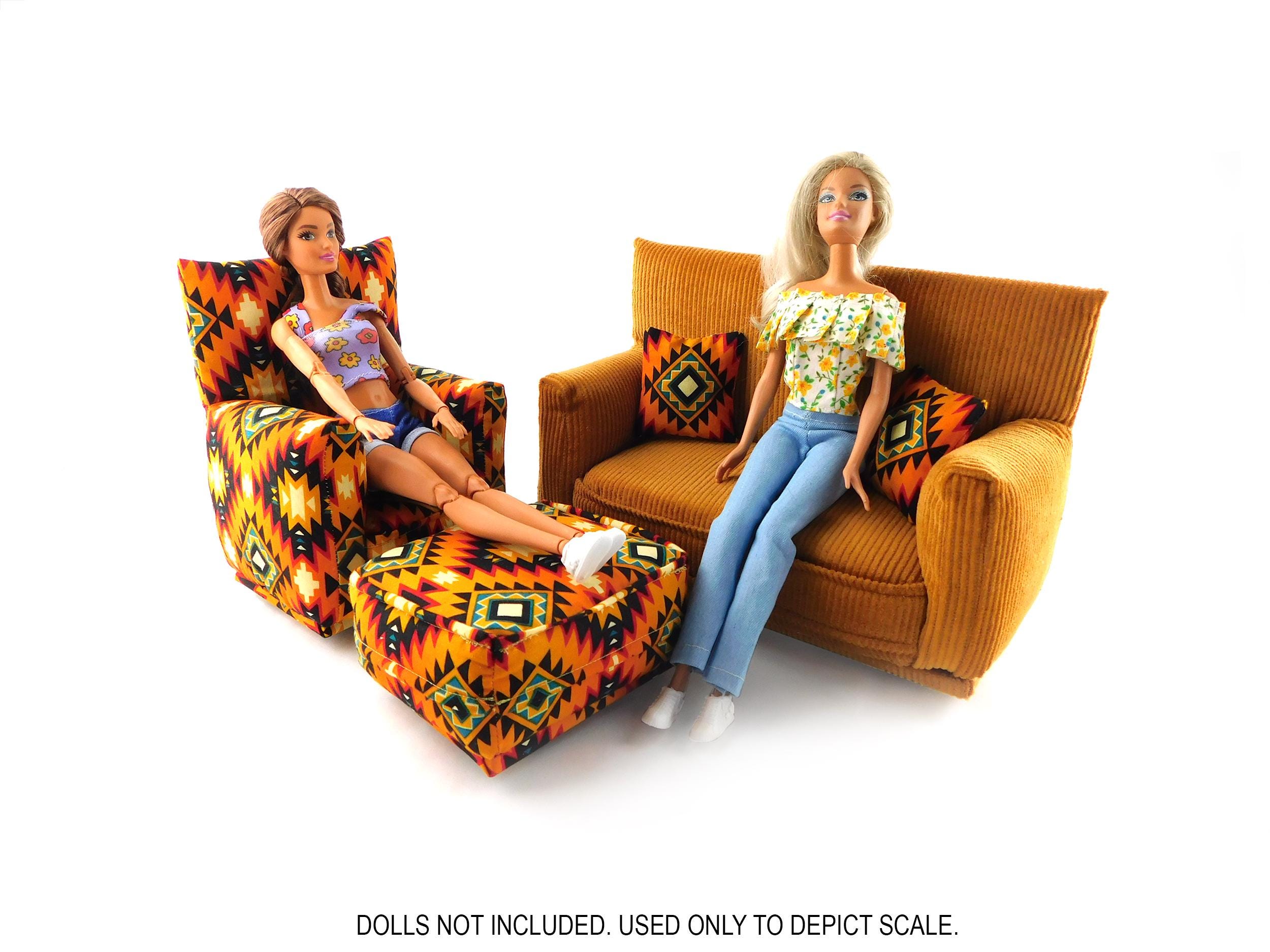 This set is handmade with sturdy wood frame construction. The Chair and Ottoman are padded and covered with an Orange, Black, Teal, Red and Yellow Native print (chair/ottoman) and Gold solid (sofa) fabric. Includes two matching pillows. This is a heavy-duty set made for normal pretend play, not a lightweight display set. This fashion doll furniture play set will provide years of usage for your special child.
