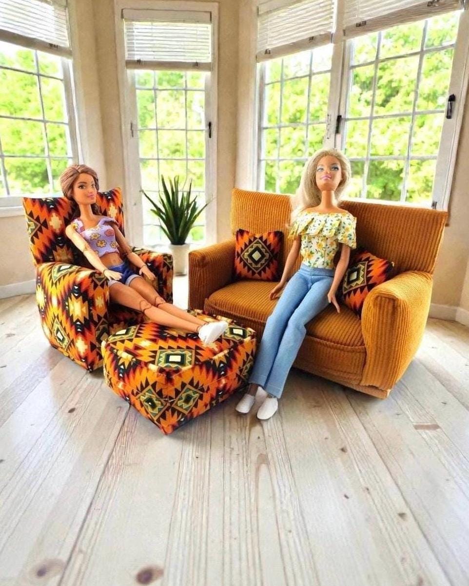 This set is handmade with sturdy wood frame construction. The Chair and Ottoman are padded and covered with an Orange, Black, Teal, Red and Yellow Native print (chair/ottoman) and Gold solid (sofa) fabric. Includes two matching pillows. This is a heavy-duty set made for normal pretend play, not a lightweight display set. This fashion doll furniture play set will provide years of usage for your special child.