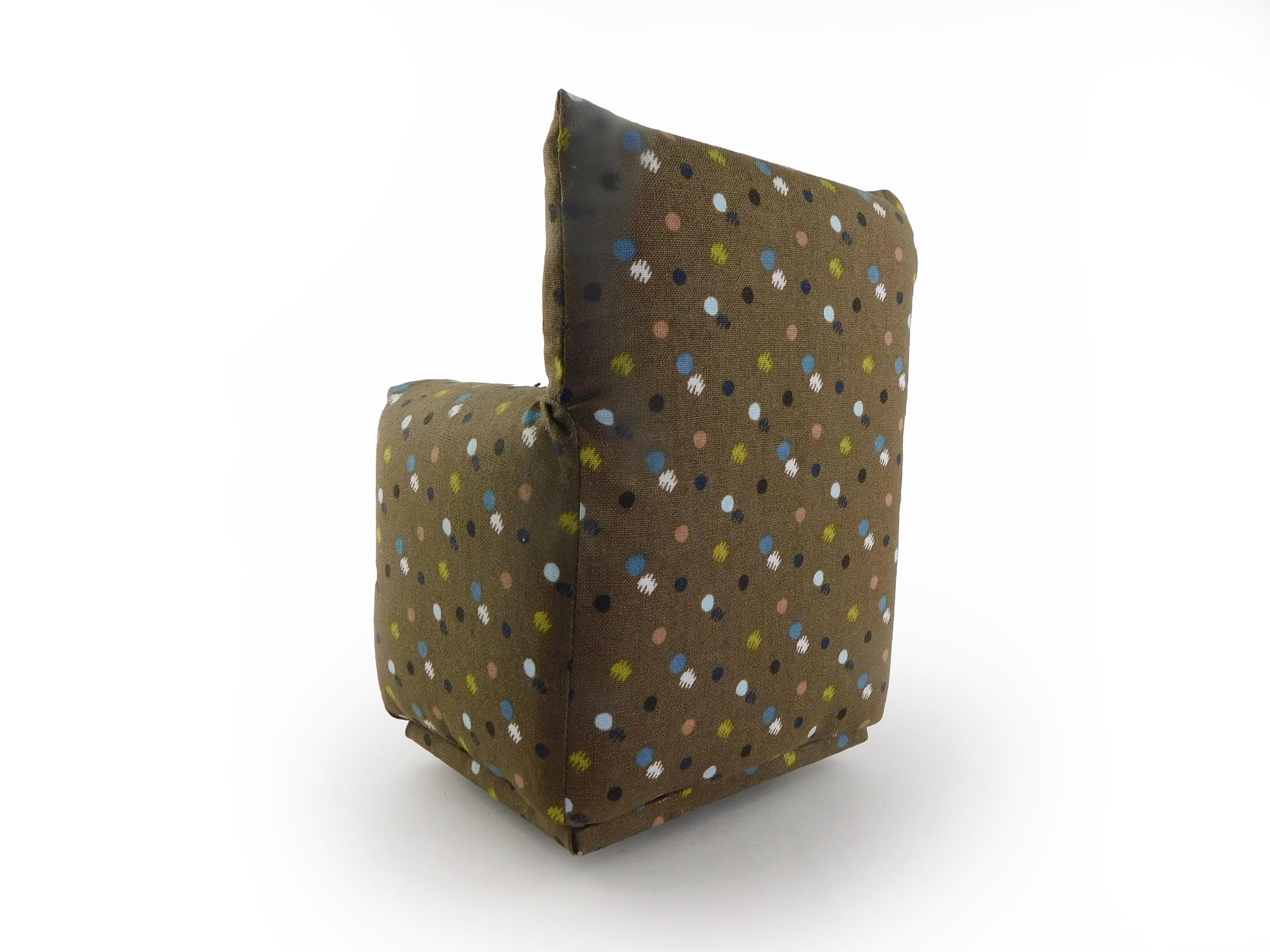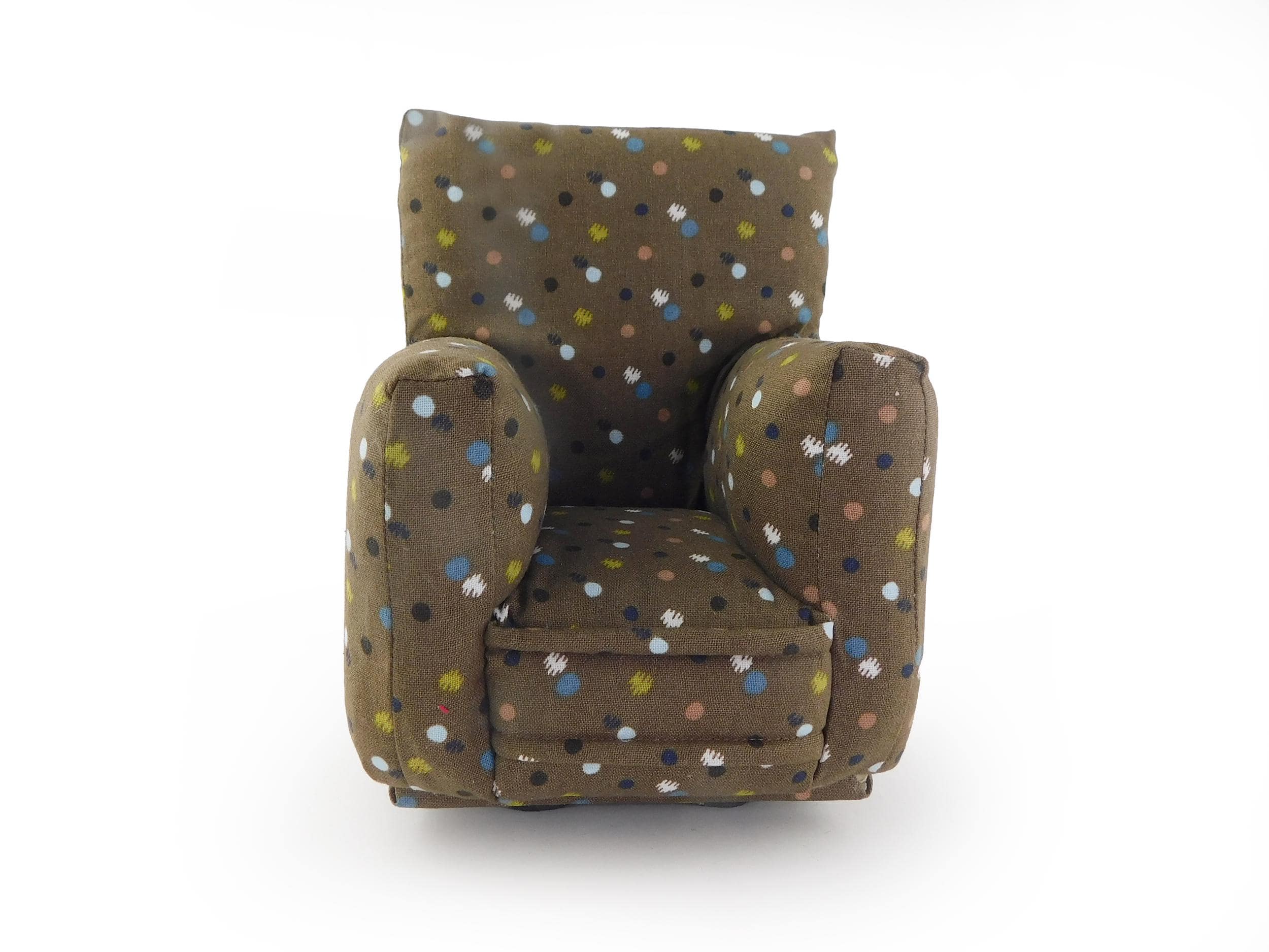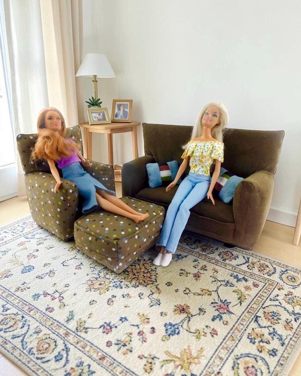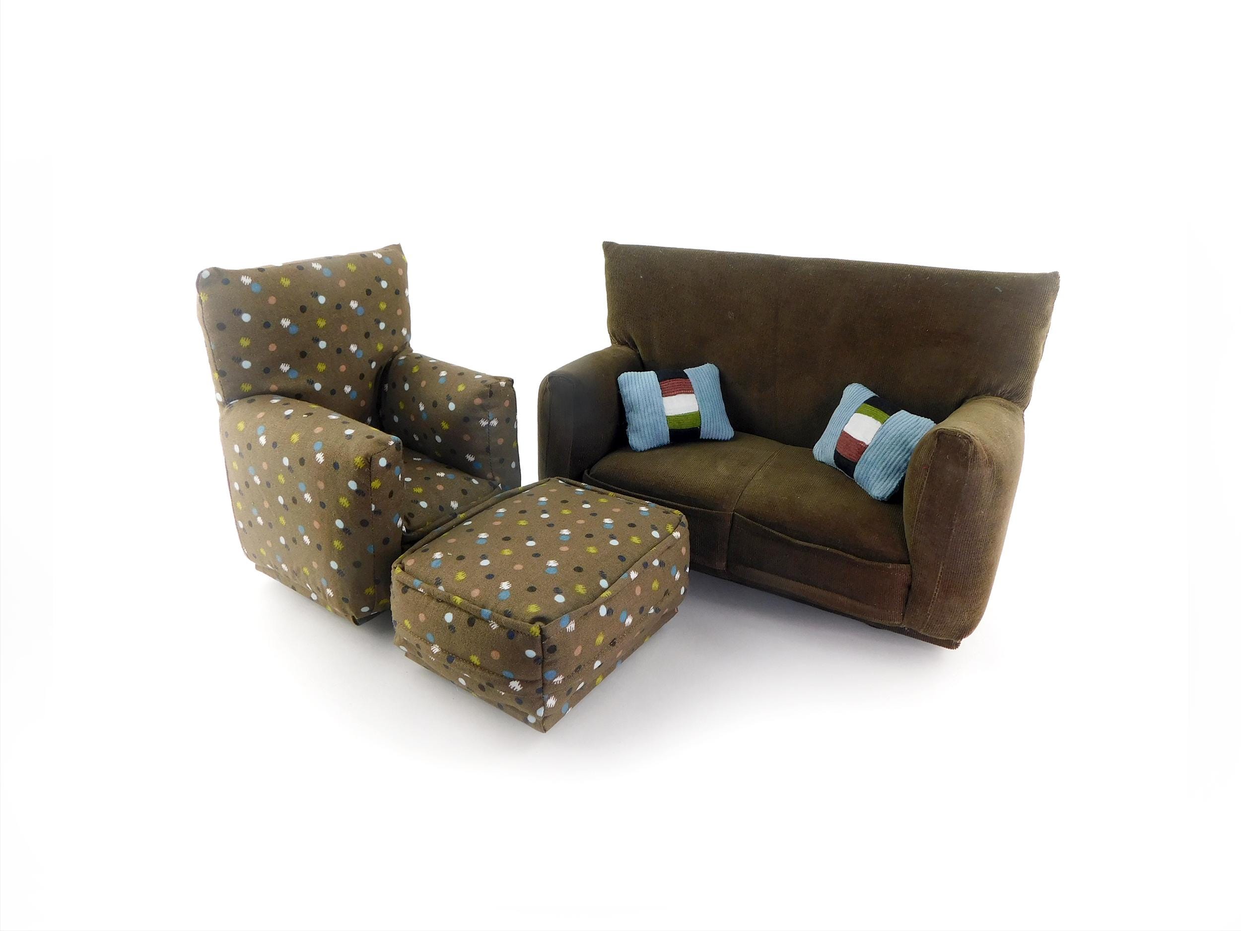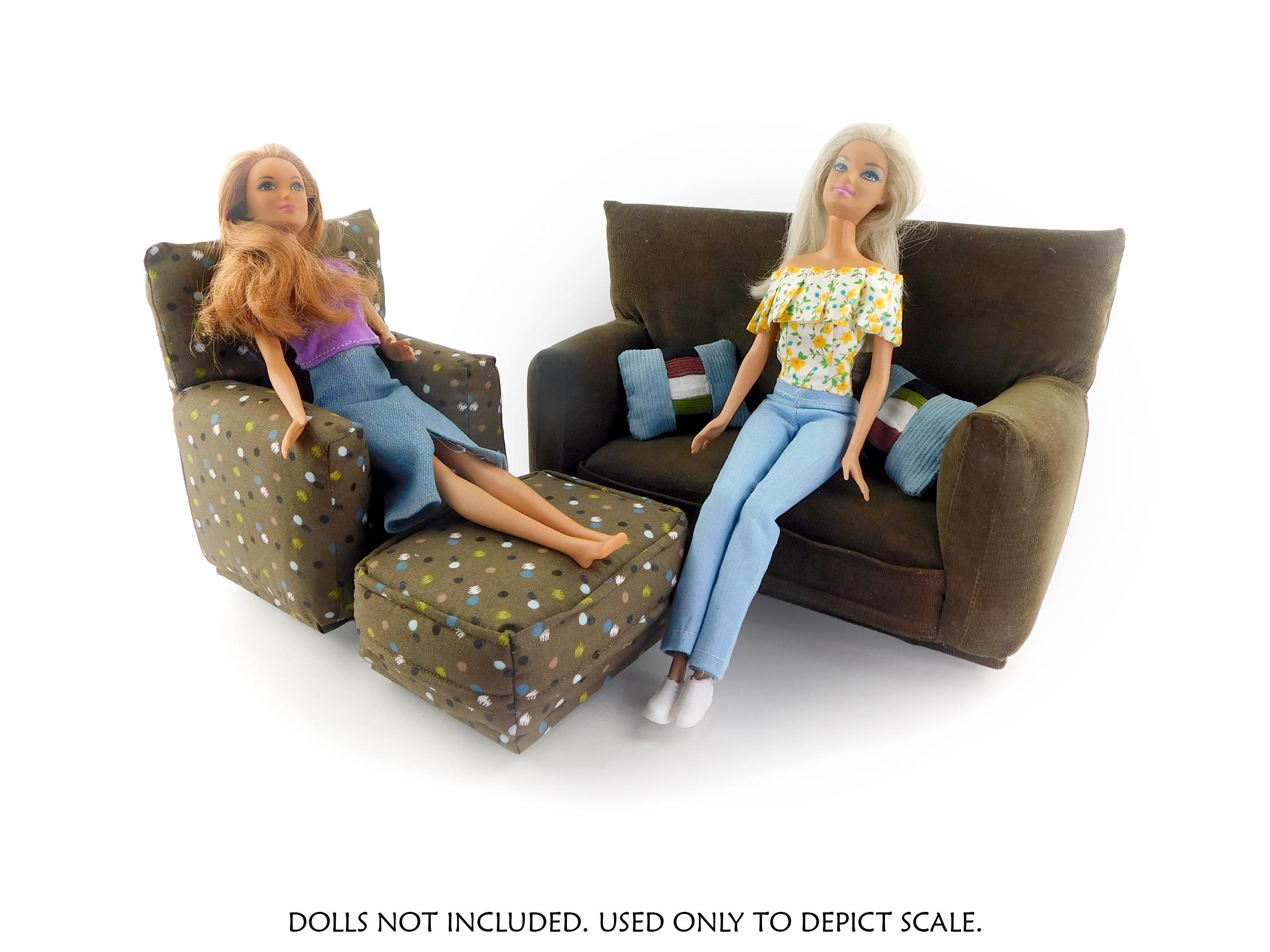 Perfect for 11" - 12" fashion dolls. This set is handmade with sturdy wood frame construction. The Chair and Ottoman are padded and covered with a Brown with multi-color spotted print (chair/ottoman) and Milk Chocolate Brown solid (sofa) fabric. Includes two matching pillows. This is a heavy-duty set made for normal pretend play, not a lightweight display set. This fashion doll furniture play set will provide years of usage for your special child.