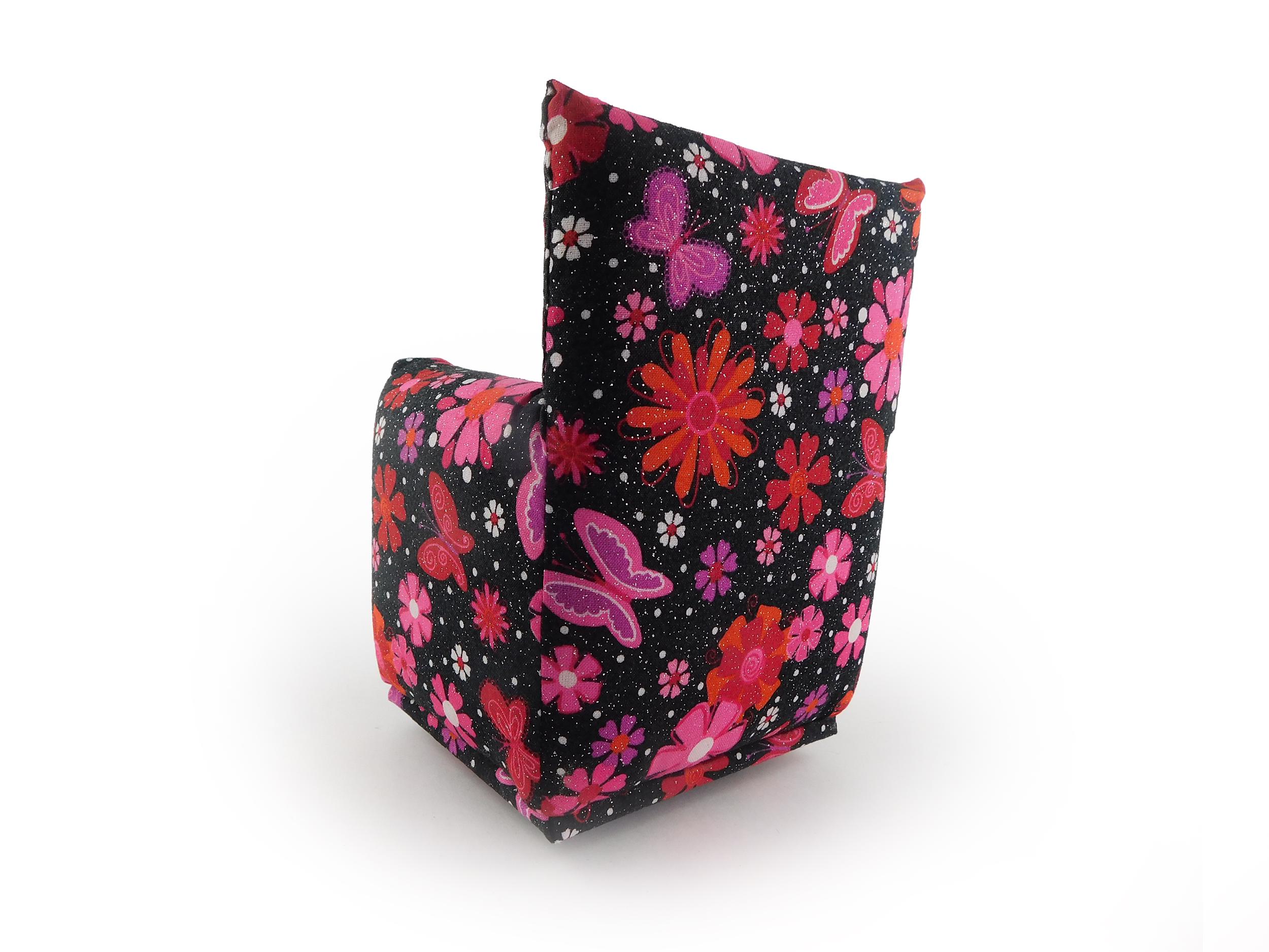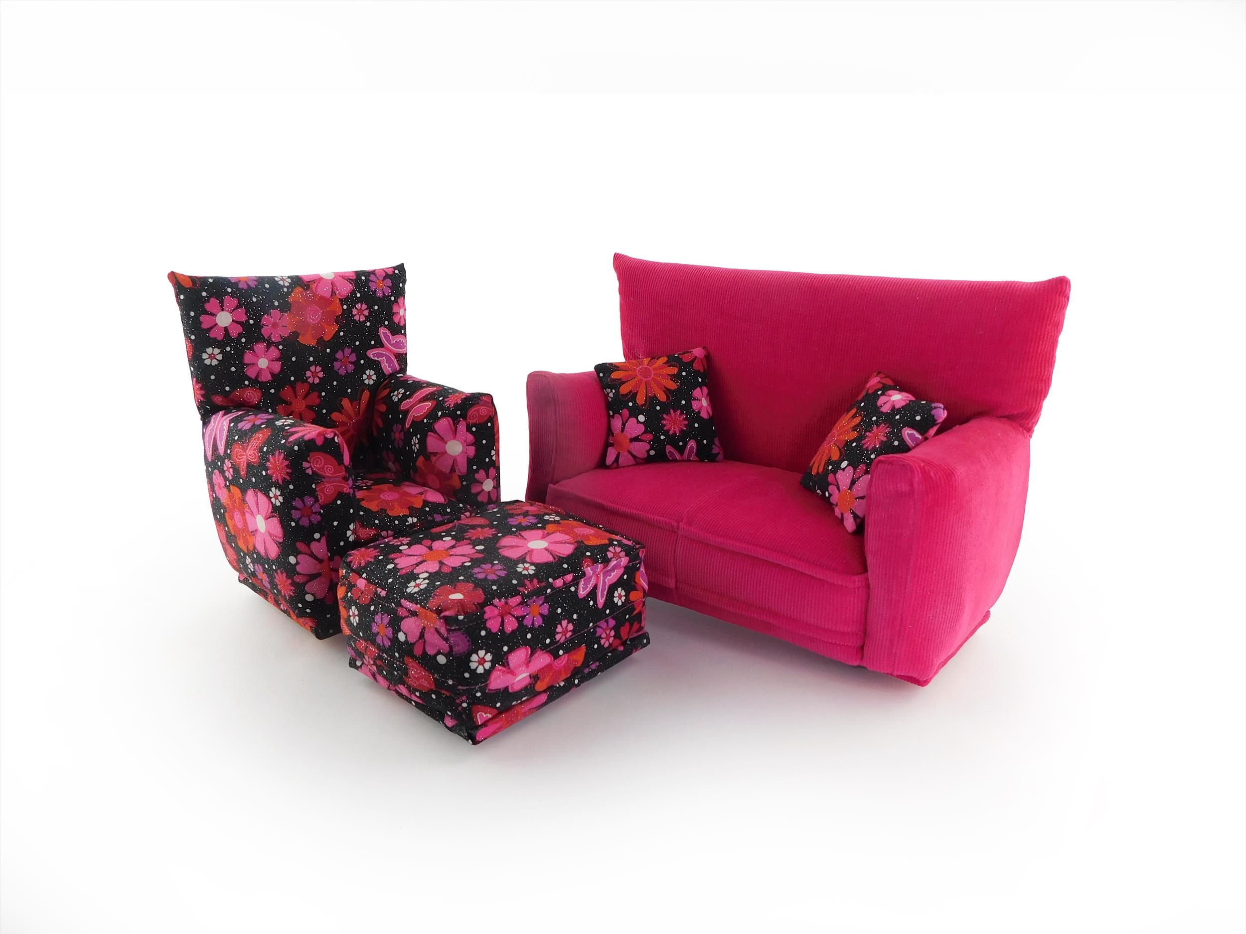 Perfect for 11" - 12" fashion dolls. This set is handmade with sturdy wood frame construction. The Chair and Ottoman are padded and covered with a Black with Pink, Red, Purple, White sparkle flower print (chair/ottoman) and Hot Pink solid (sofa) fabric. Includes two matching pillows. This is a heavy-duty set made for normal pretend play, not a lightweight display set. This fashion doll furniture play set will provide years of usage for your special child.