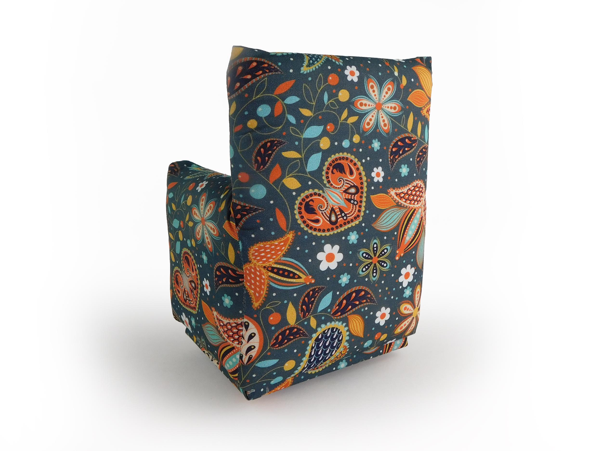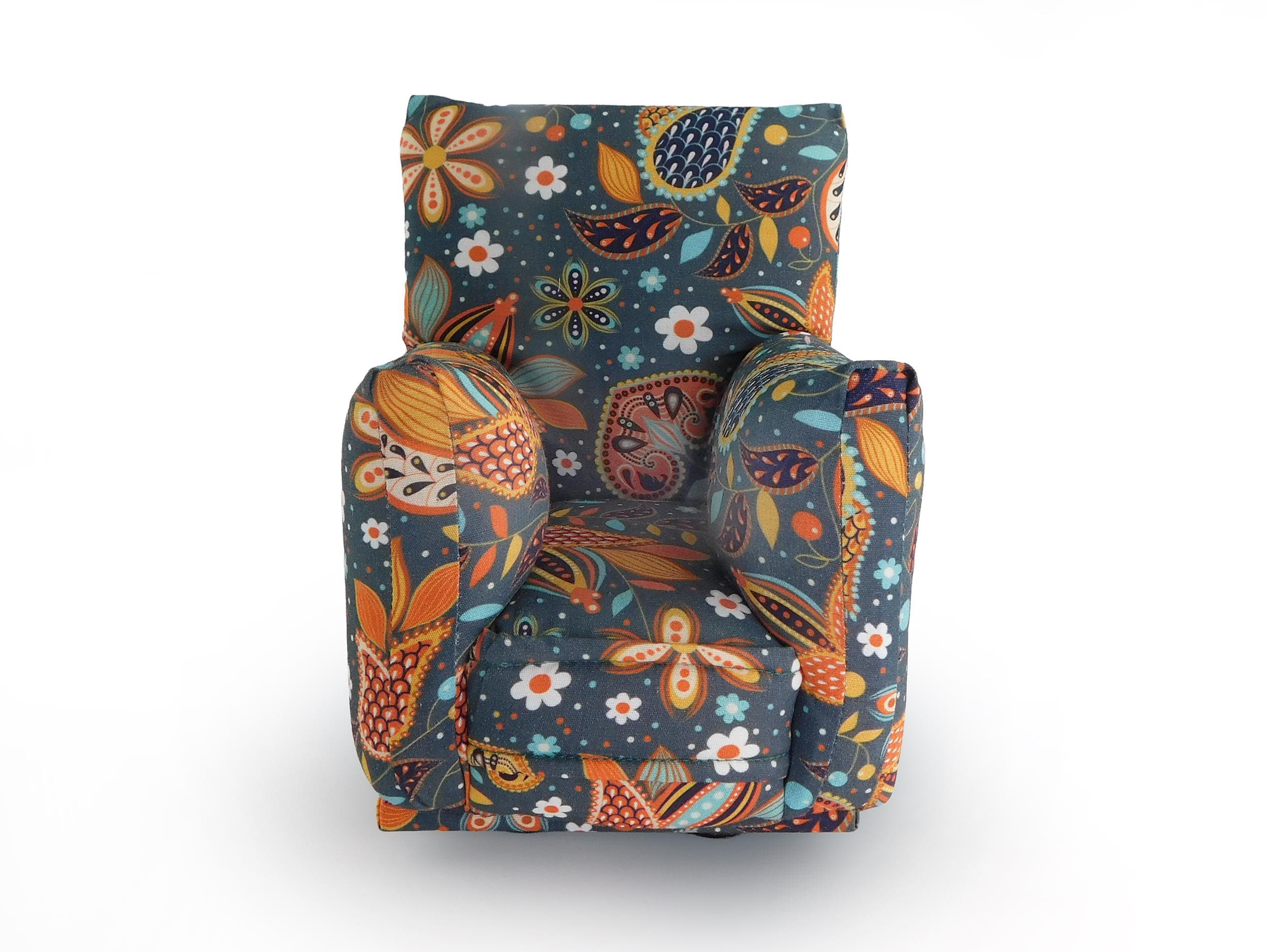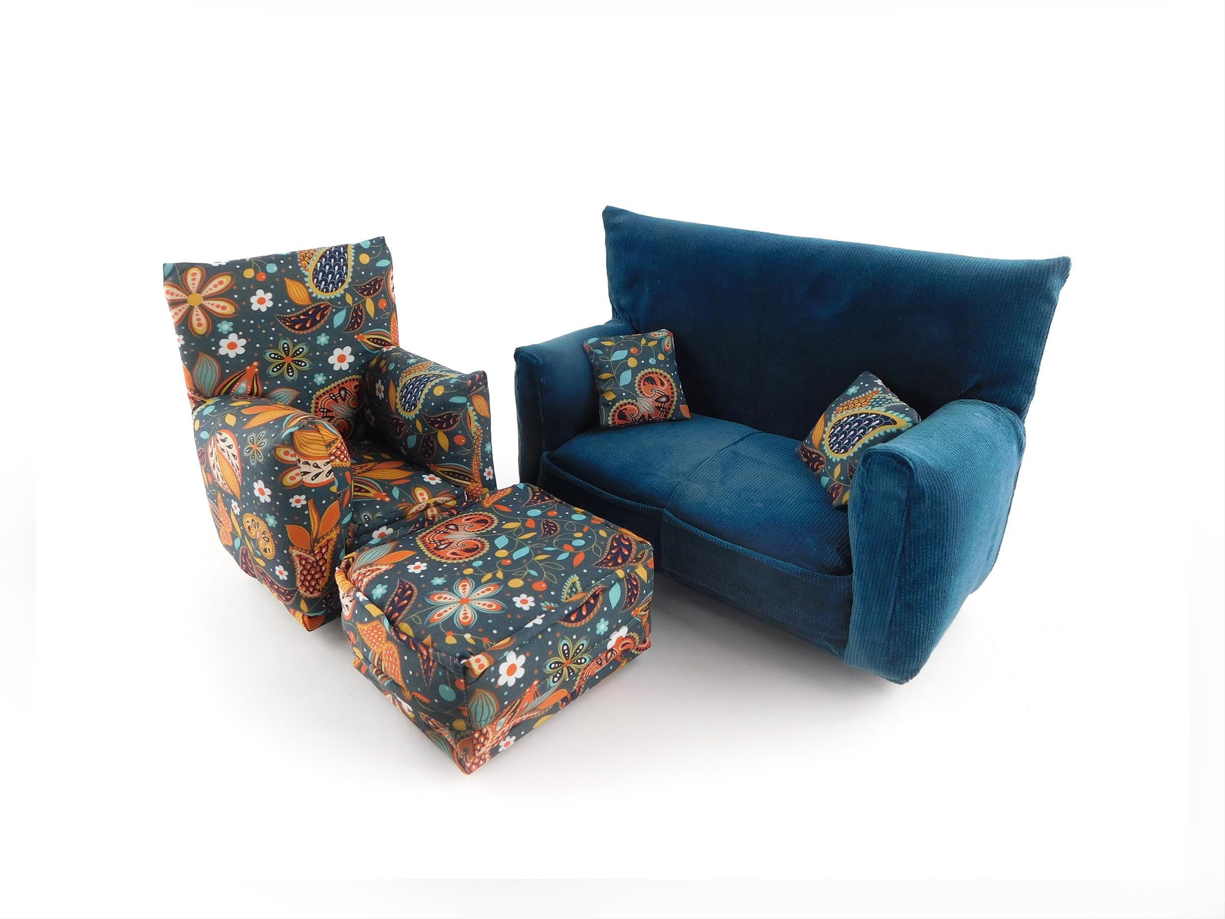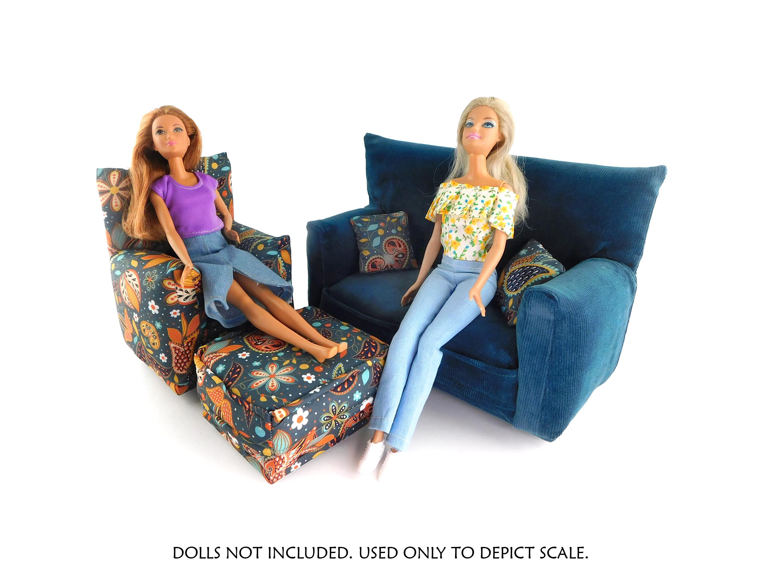 Perfect for 11" - 12" fashion dolls. This set is handmade with sturdy wood frame construction. The Chair and Ottoman are padded and covered with a Grey with multi-color modern paisley print (chair/ottoman) and Dark Teal Green solid (sofa) fabric. Includes two matching pillows. This is a heavy-duty set made for normal pretend play, not a lightweight display set. This fashion doll furniture play set will provide years of usage for your special child.