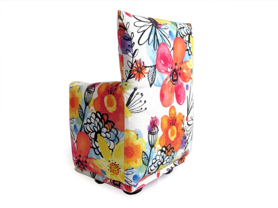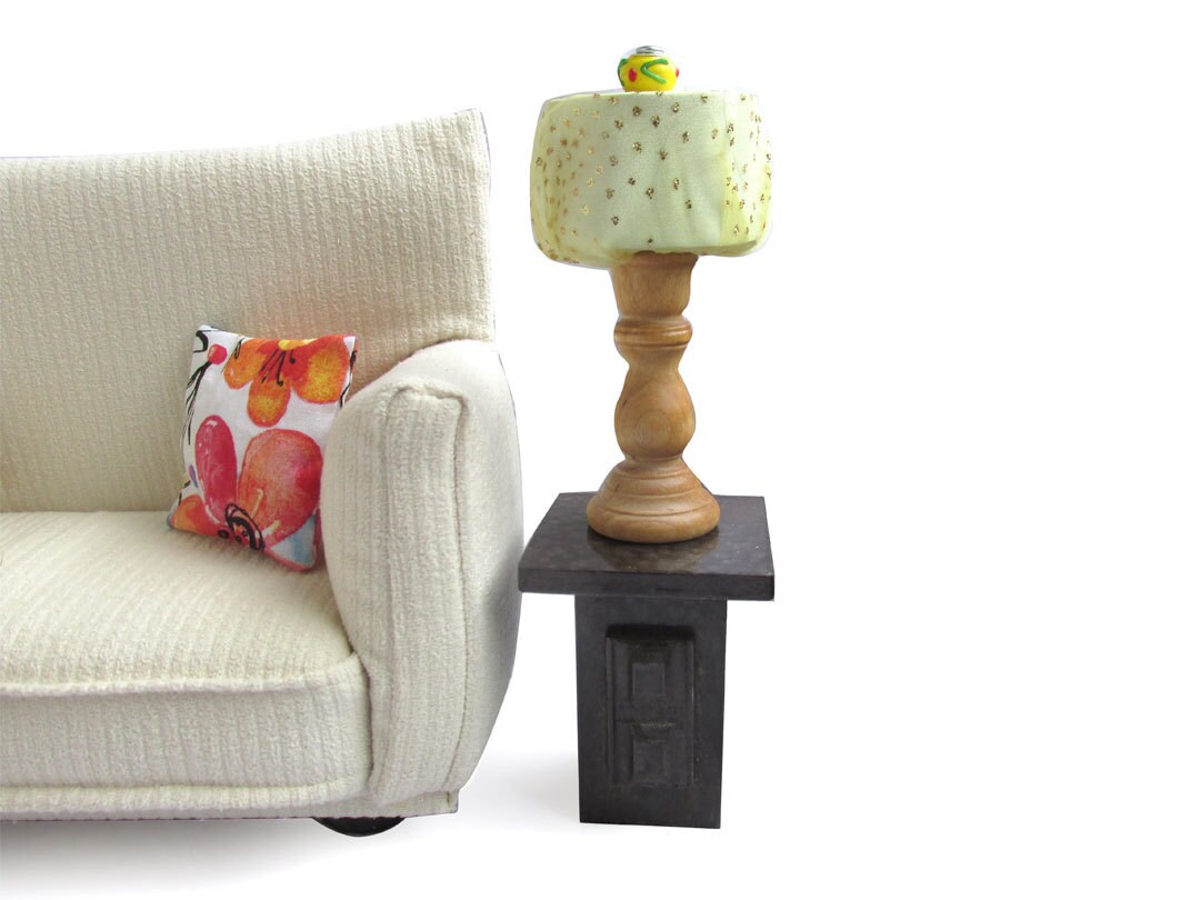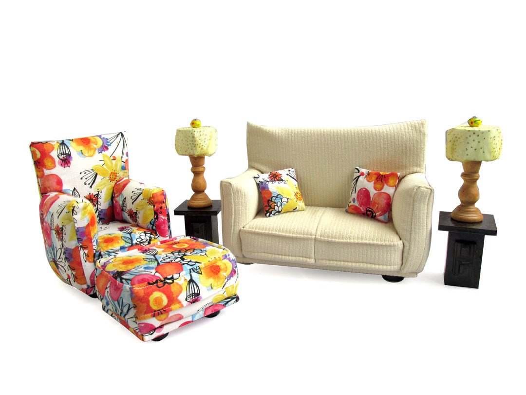 This set is handmade with sturdy wood frame construction. The Sofa, Chair and Ottoman are padded and covered with an White, Orange, Yellow colorful flower print (chair/ottoman) and Pale Yellow (sofa) fabric. The lamp shades are made with a Yellow jeweled sheer fabric. The covering for the furniture is machine sewn for added durability. This Barbie doll furniture play set will provide years of usage for your special child.