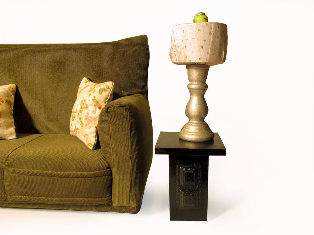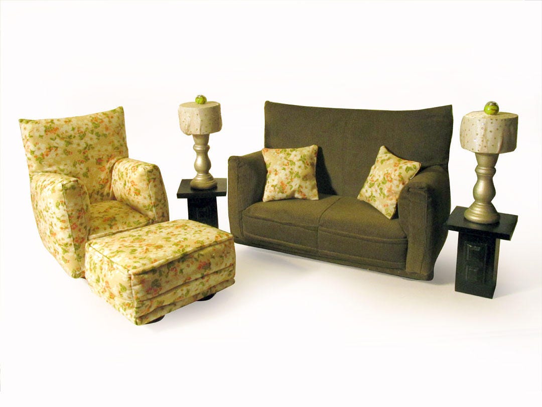 This set is handmade with sturdy wood frame construction. The Sofa, Chair and Ottoman are padded and covered with a Beige, Green, White flower print (chair/ottoman) and Olive Green (sofa) fabric. The lamp shades are made with a Beige jeweled sheer fabric. The covering for the furniture is machine sewn for added durability. This Barbie doll furniture play set will provide years of usage for your special child.