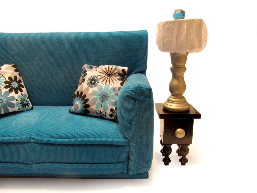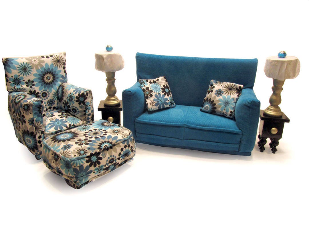 This set is handmade with sturdy wood frame construction. The Sofa, Chair and Ottoman are padded and covered with a Teal, Gray, Black, White print (chair/ottoman) and Teal (sofa) fabric. The lamp shades are made with a White sparkled sheer fabric. The covering for the furniture is machine sewn for added durability. This Barbie doll furniture play set will provide years of usage for your special child.