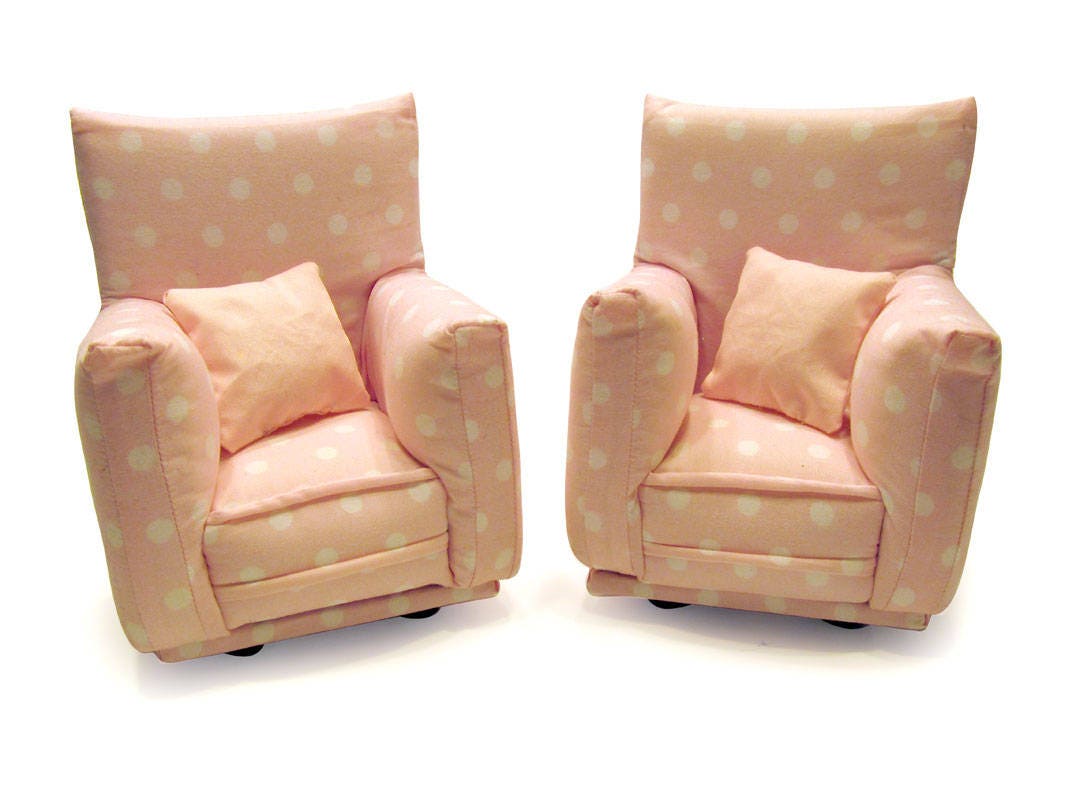 This Barbie doll furniture play set will provide years of usage for your special child. This set is handmade with sturdy wood frame construction. The two chairs are padded and covered with a pale pink and white polka dot print fabric includes two solid pink pillows . The covering for the furniture is machine sewn for added durability.
