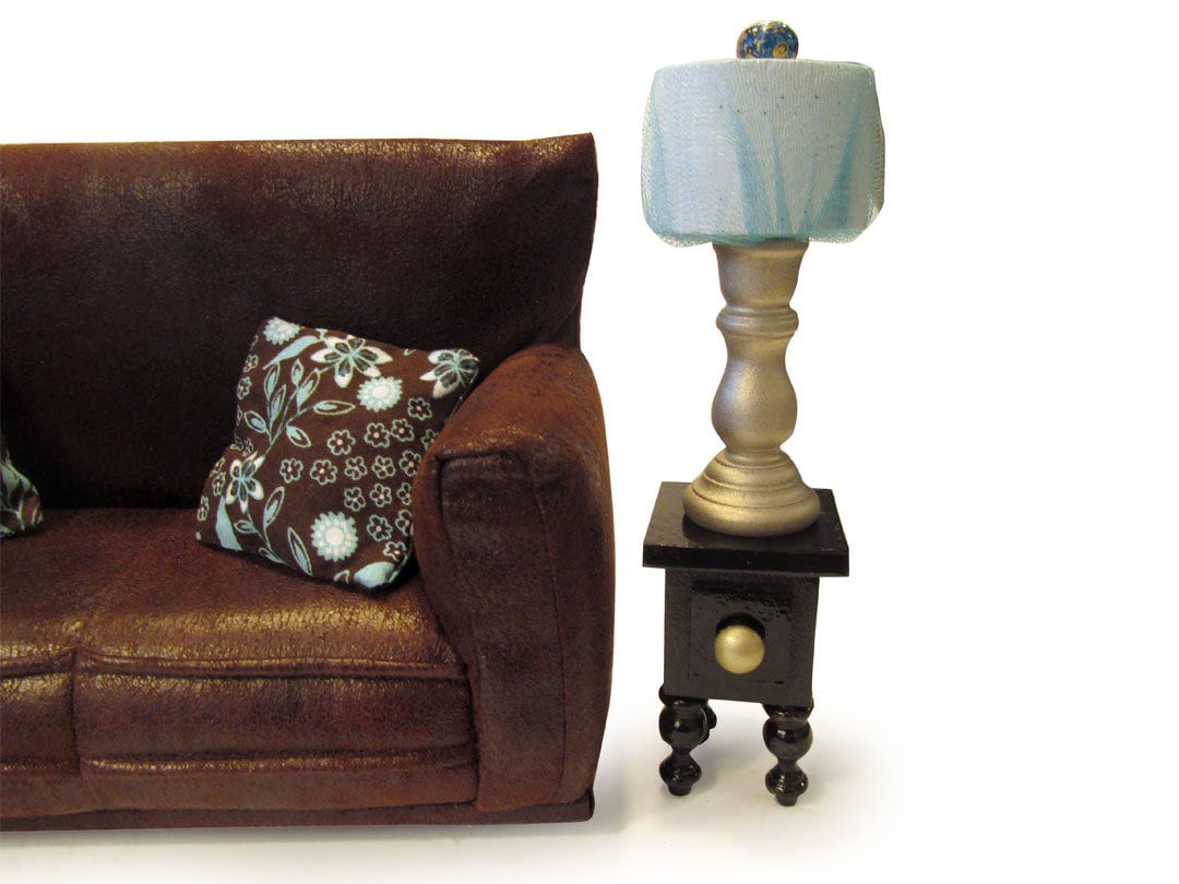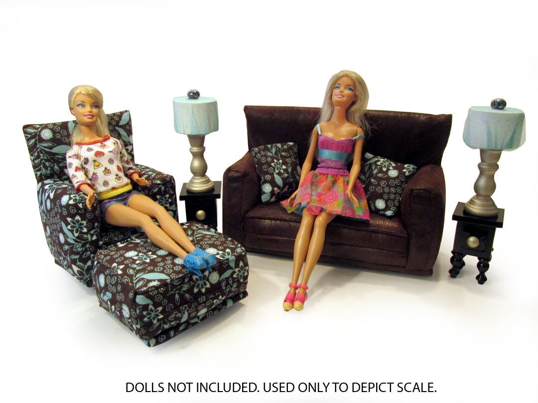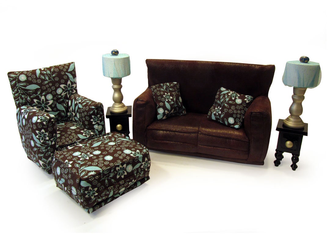 This set is handmade with sturdy wood frame construction. The Sofa, Chair and Ottoman are padded and covered with a Brown/Teal/White flower print (chair/ottoman) and Brown faux leather (sofa) fabric. The lamp shades are made with a Teal sparkle mesh fabric. This Barbie doll furniture play set will provide years of usage for your special child.