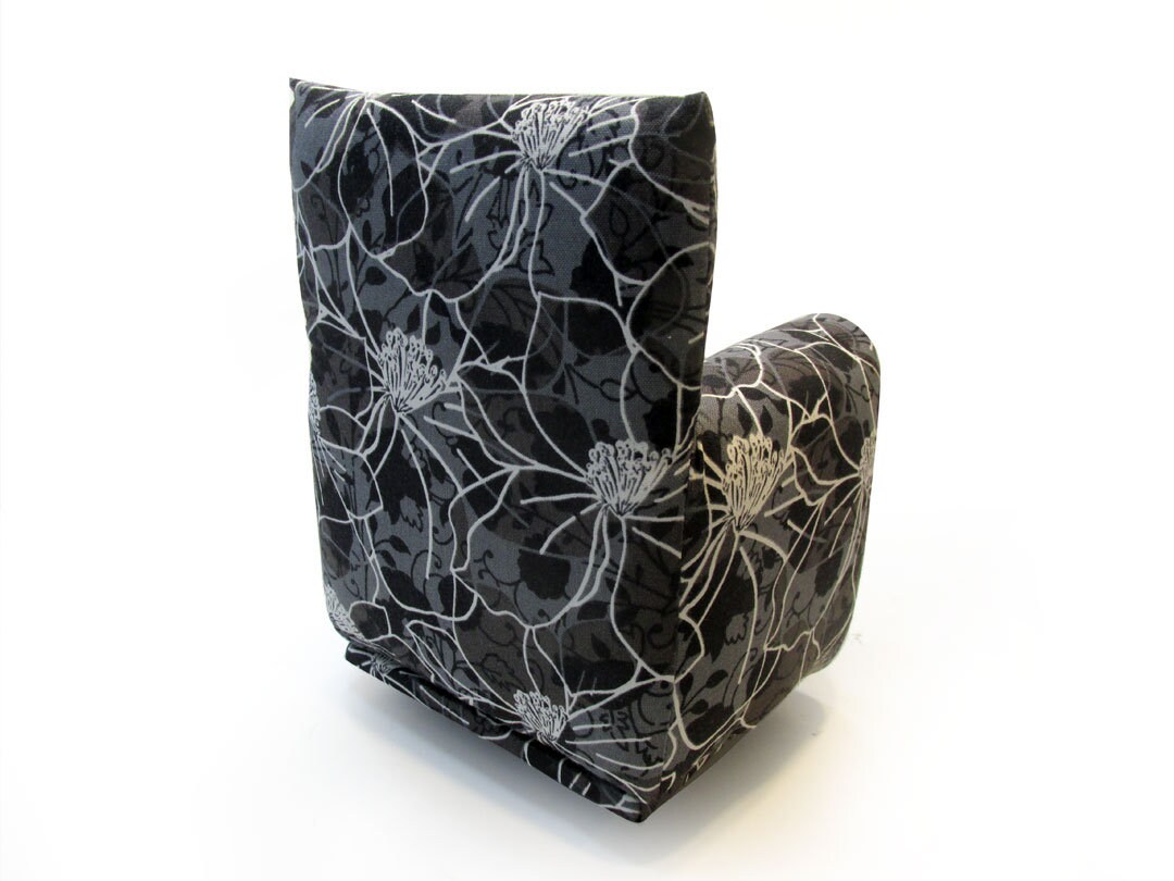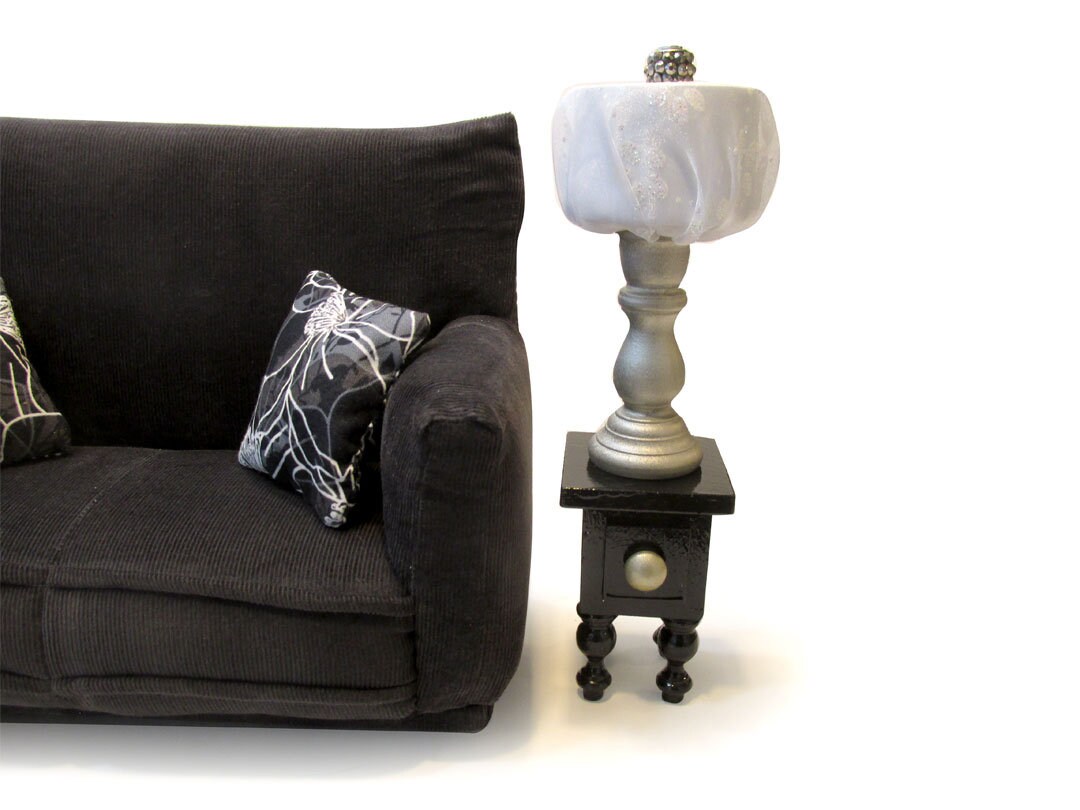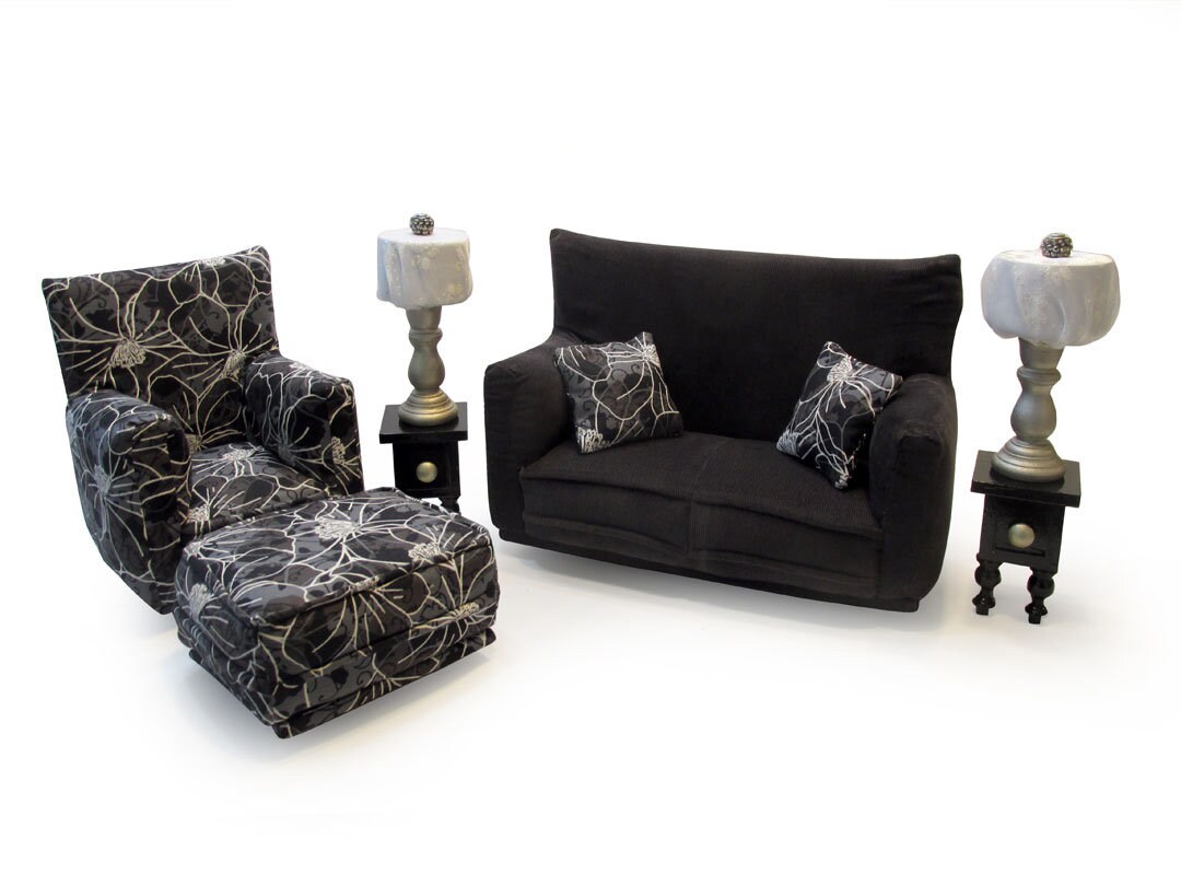 This set is handmade with sturdy wood frame construction. The Sofa, Chair and Ottoman are padded and covered with a White outlined flower on Gray print (chair/ottoman) and Charcoal Gray fabric. The lamp shades are made with a White sparkle sheer fabric. This Barbie doll furniture play set will provide years of usage for your special child.