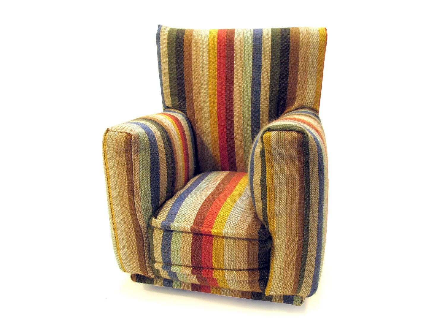 This set is handmade with sturdy wood frame construction. The Chair and Ottoman are padded and covered with a Multi=Colored Striped print fabric. This Barbie doll Chair & Ottoman furniture play set will provide years of usage for your special child.