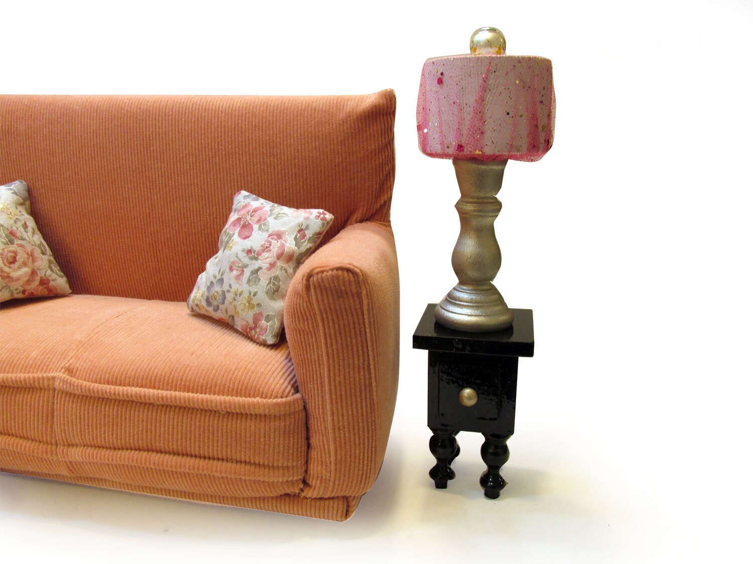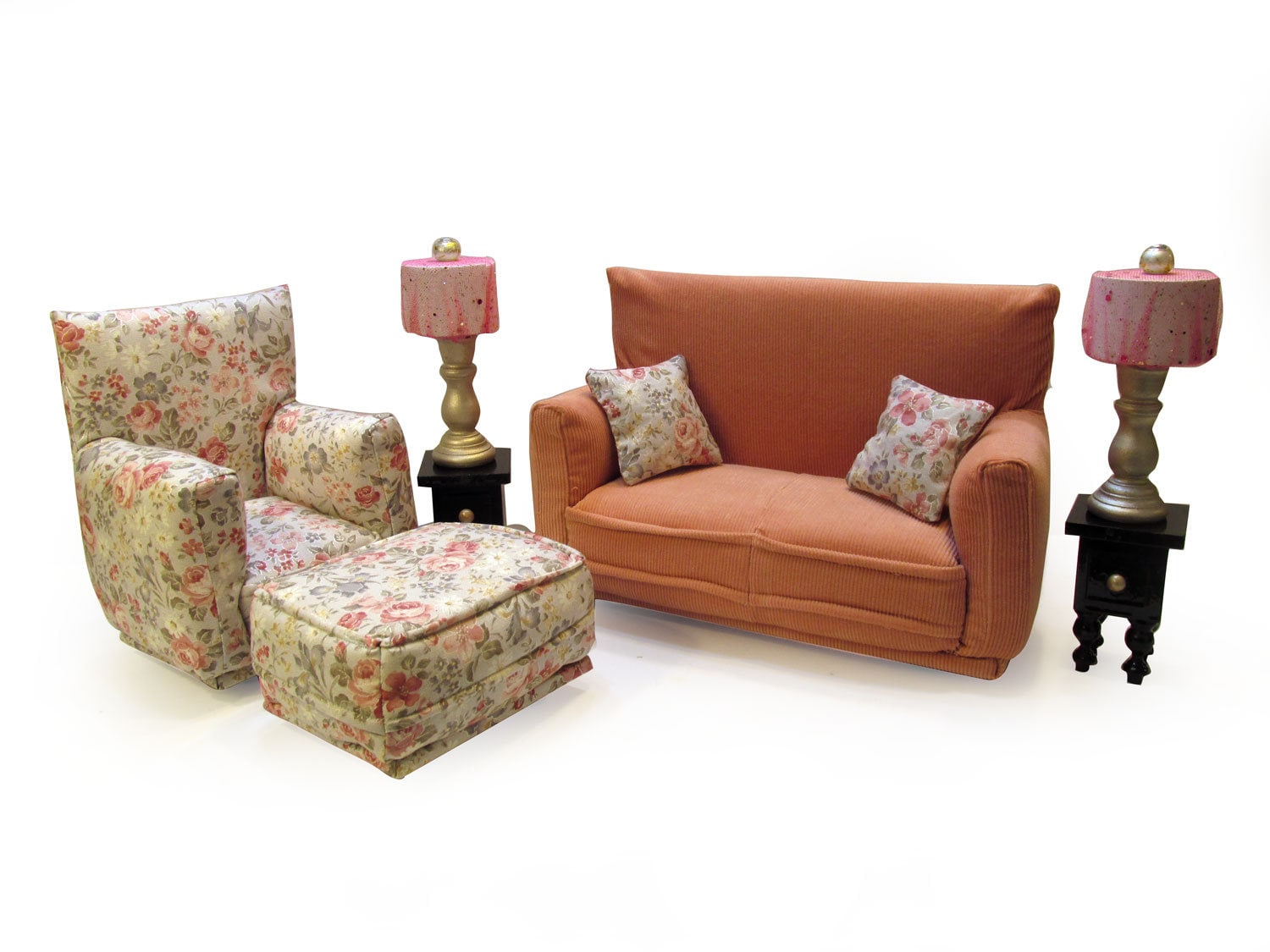 This set is handmade with sturdy wood frame construction. The Sofa, Chair and Ottoman are padded and covered with Gray/Pink/White flower print (chair/ottoman) and Pink (sofa) fabric. The lamp shades are made with a Pink Sparkle mesh fabric. This Barbie doll furniture play set will provide years of usage for your special child.