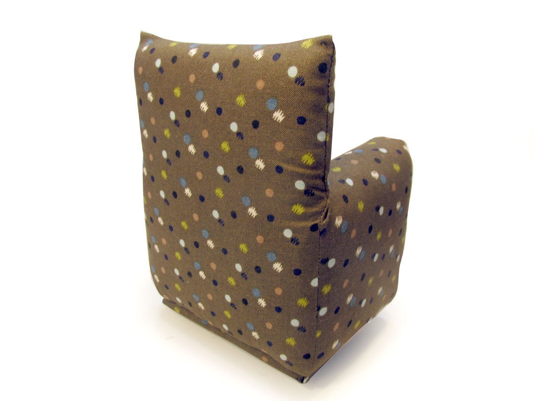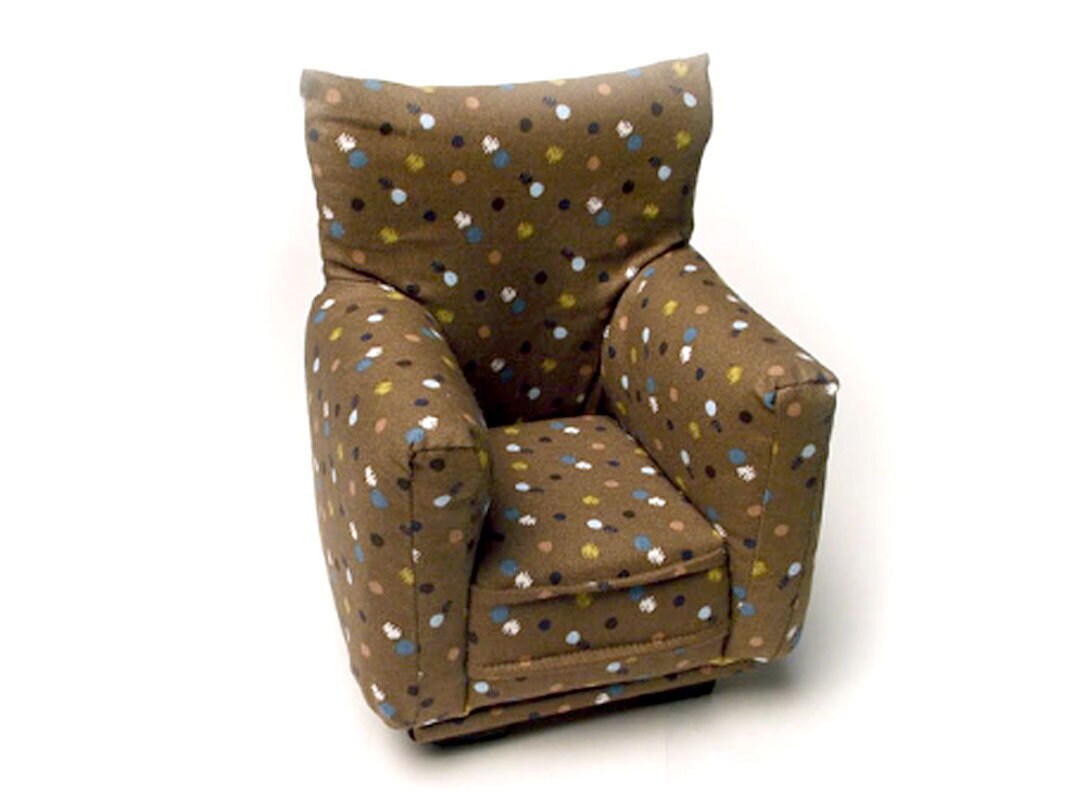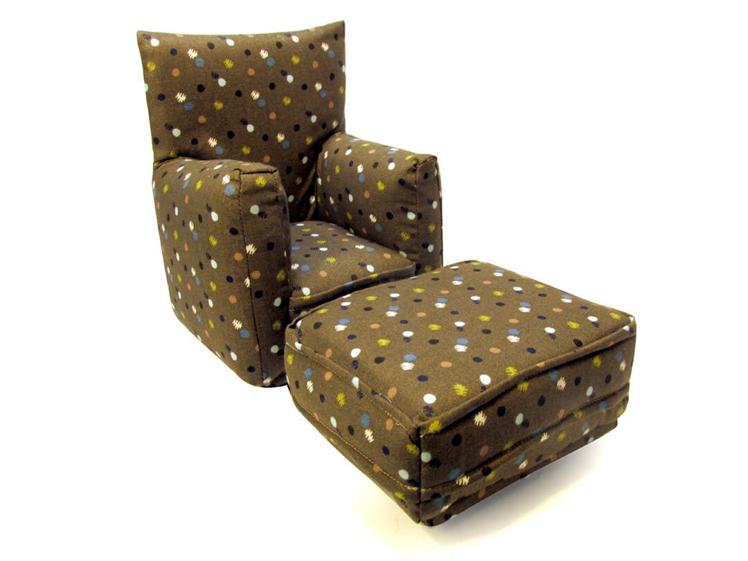 This set is handmade with sturdy wood frame construction. The Chair and Ottoman are padded and covered with a Brown with Multi-Colored spot print fabric. The covering for the furniture is machine sewn for added durability. This Barbie doll Chair & Ottoman furniture play set will provide years of usage for your special child.
