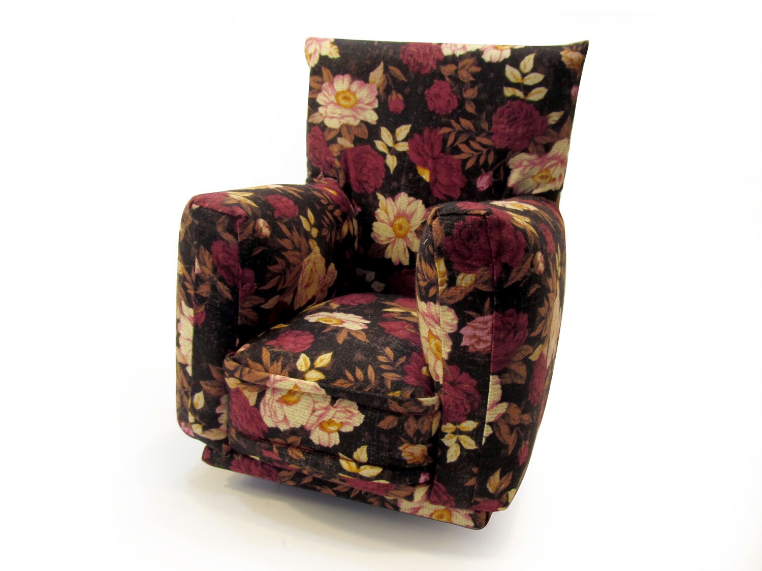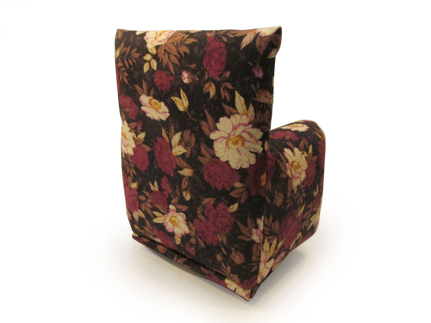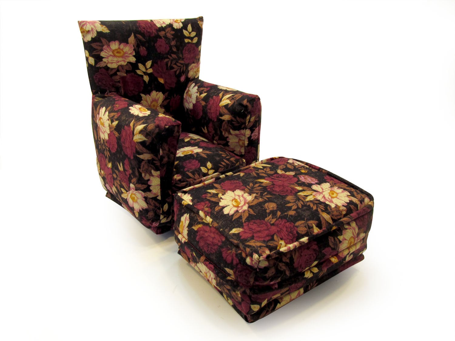 This set is handmade with sturdy wood frame construction. The Chair and Ottoman are padded and covered with a Burgandy and Beige flower print fabric. The covering for the furniture is machine sewn for added durability. This Barbie doll Chair & Ottoman furniture play set will provide years of usage for your special child.