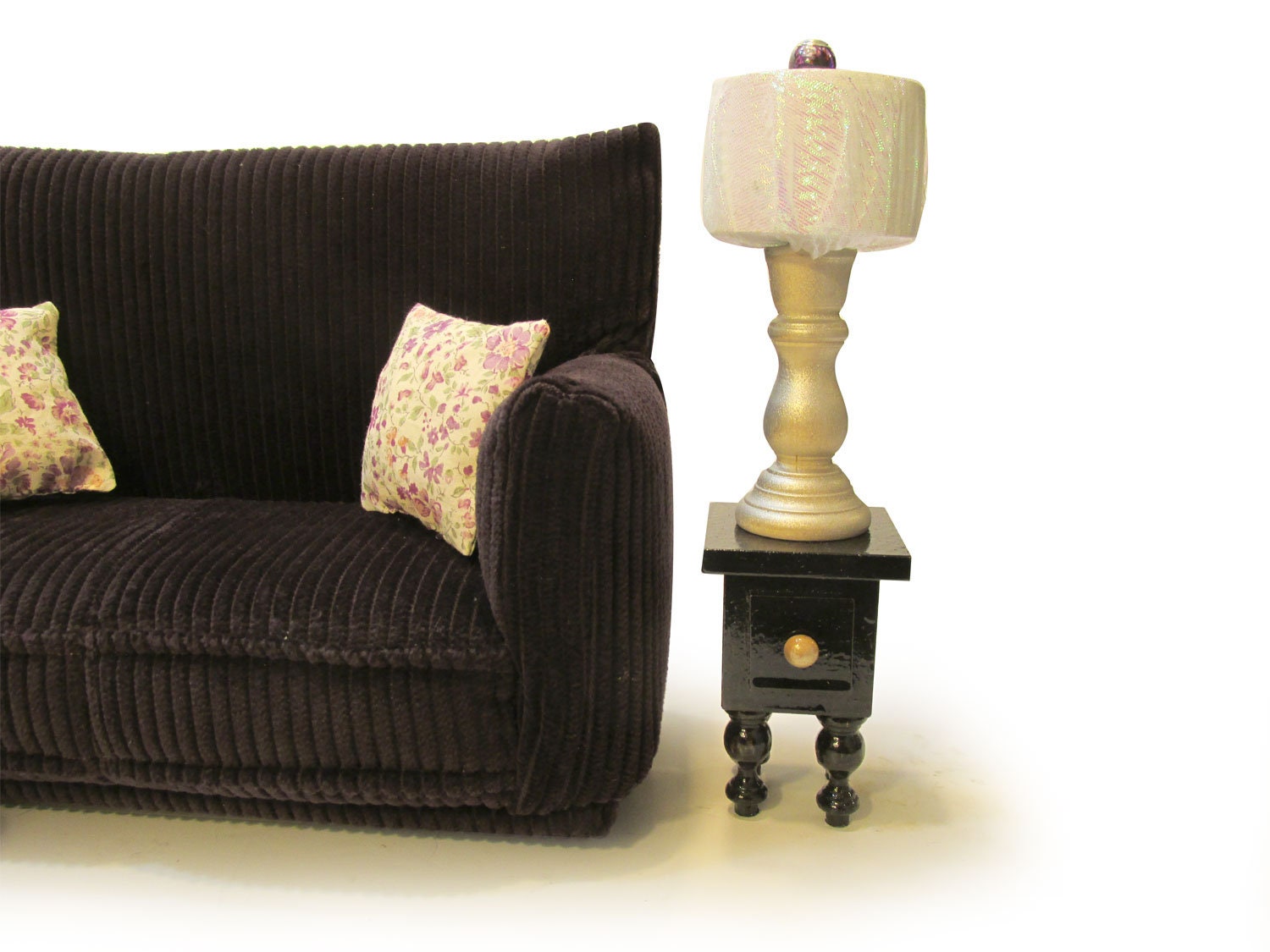 This set is handmade with sturdy wood frame construction. The Sofa, Chair and Ottoman are padded and covered with a Beige Purple flower print (chair/ottoman) and Dark Plum Purple (sofa) fabric. The lamp shades are made with a Iridescent sheer fabric. This Barbie doll furniture play set will provide years of usage for your special child.