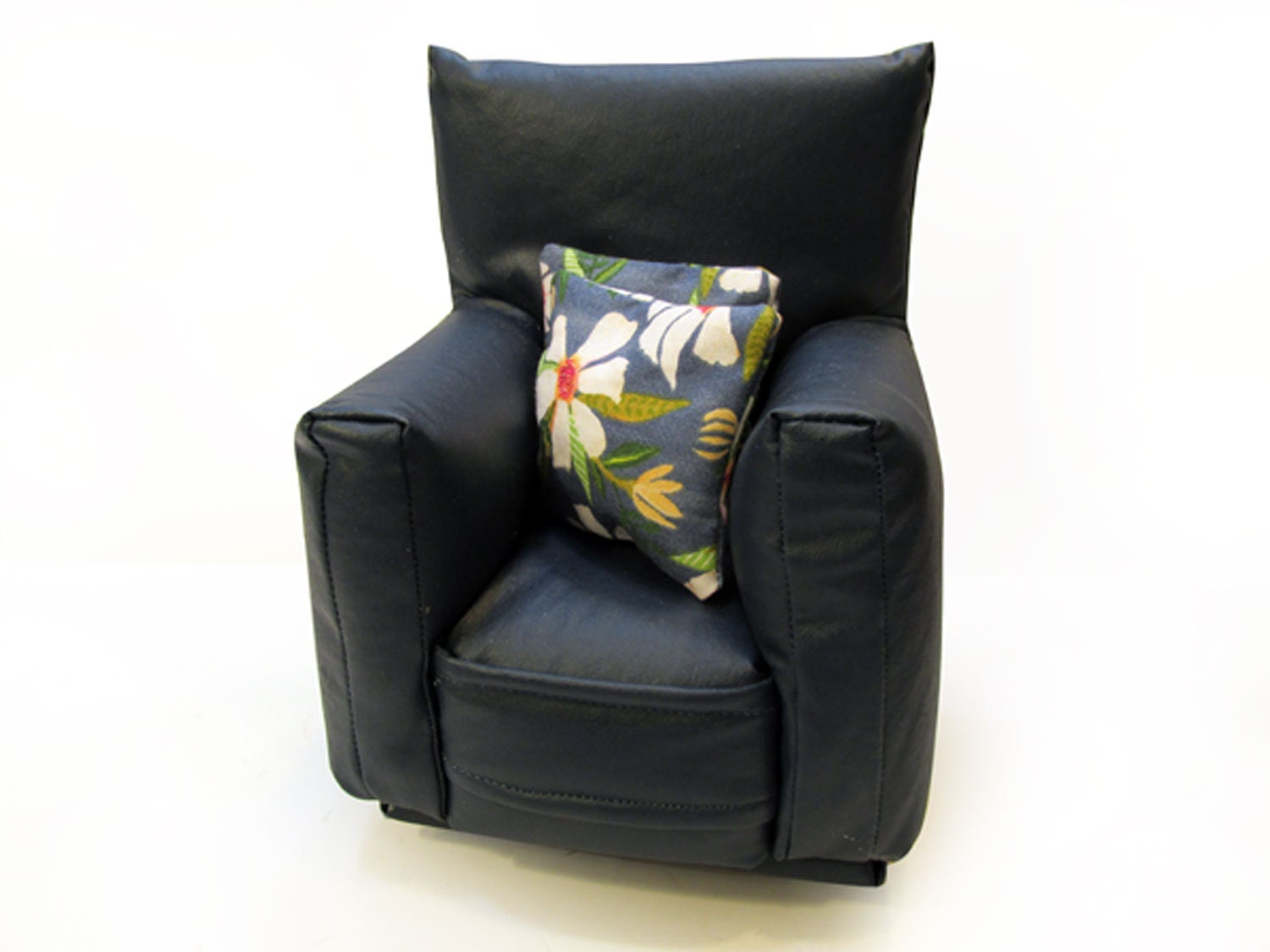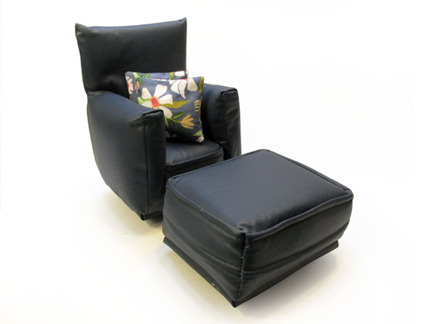 This set is handmade with sturdy wood frame construction. The Chair and Ottoman are padded and covered with a Faux Navy Blue leather fabric and two White flower print pillows. This Barbie doll Chair & Ottoman furniture play set will provide years of usage for your special child.