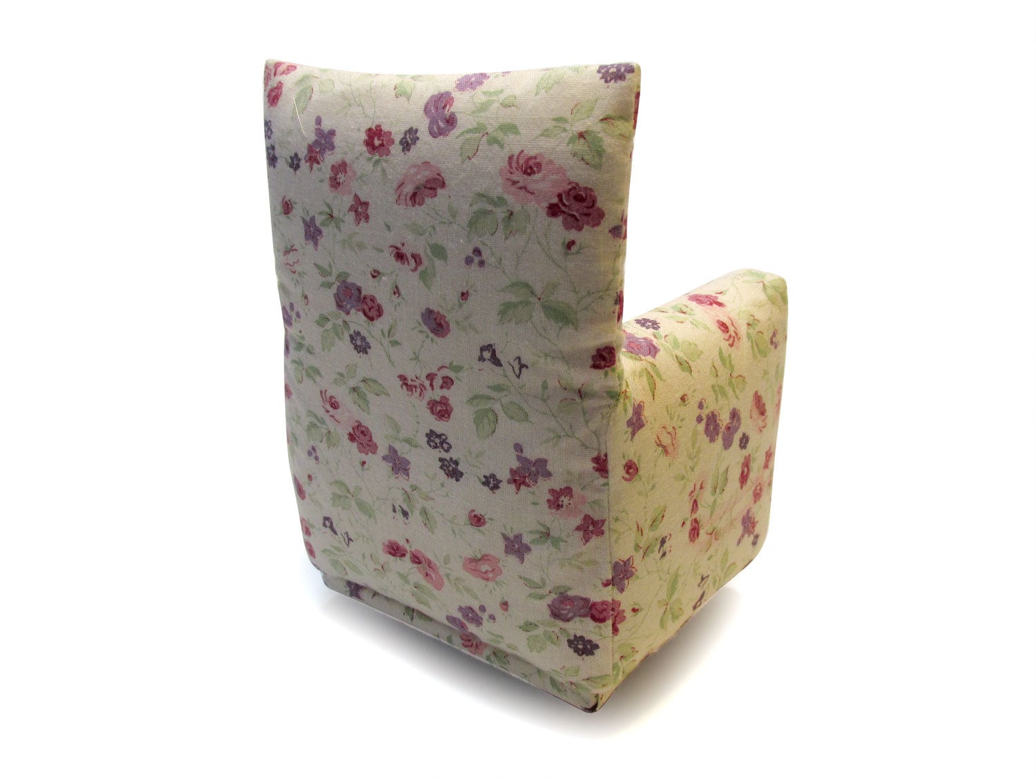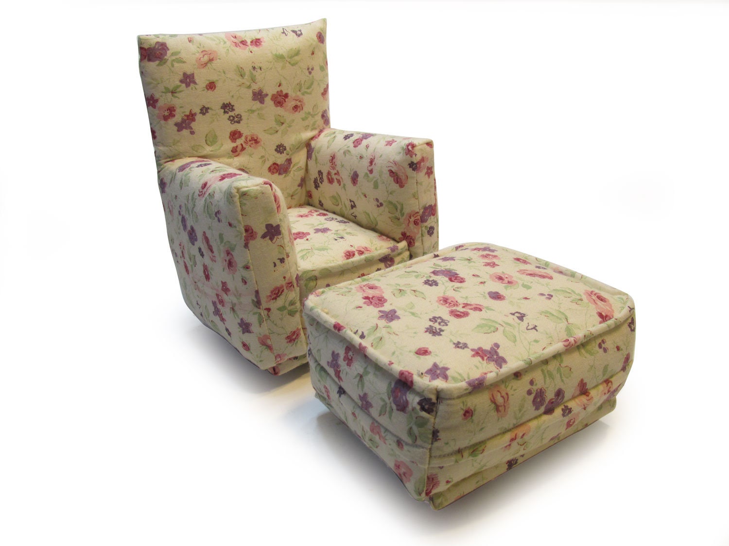 This set is handmade with sturdy wood frame construction. The Chair and Ottoman are padded and covered with a Beige and Purple/Pink/Green flower print fabric. The covering for the furniture is machine sewn for added durability. This Barbie doll Chair & Ottoman furniture play set will provide years of usage for your special child.