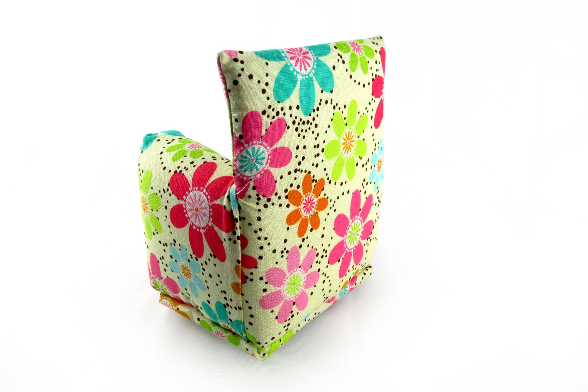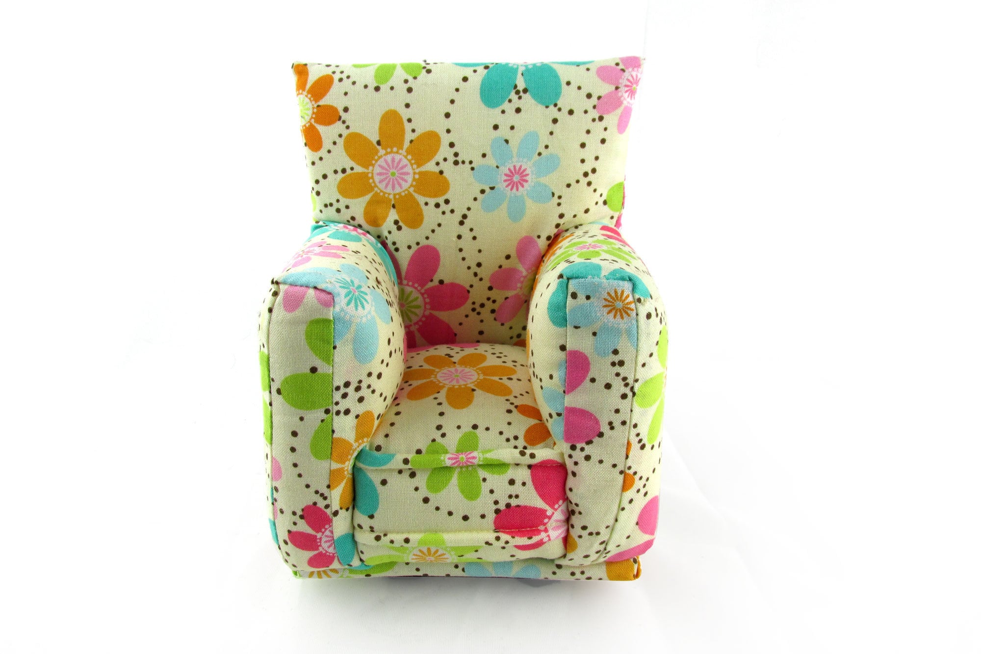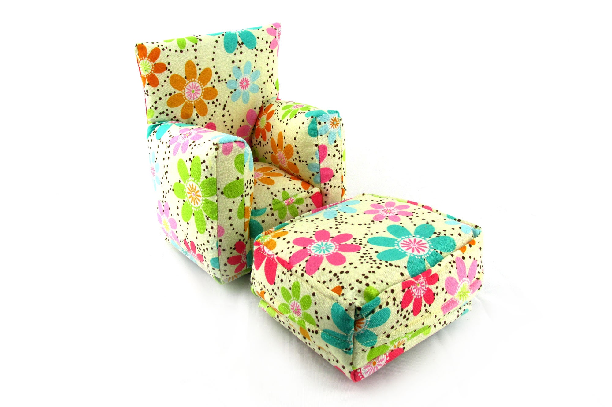 This set is handmade with sturdy wood frame construction. The Chair and Ottoman are padded and covered with a Pale Yellow with large Teal, Pink, Lime Green, Orange flower print fabric. This Barbie doll Chair & Ottoman furniture play set will provide years of usage for your special child.