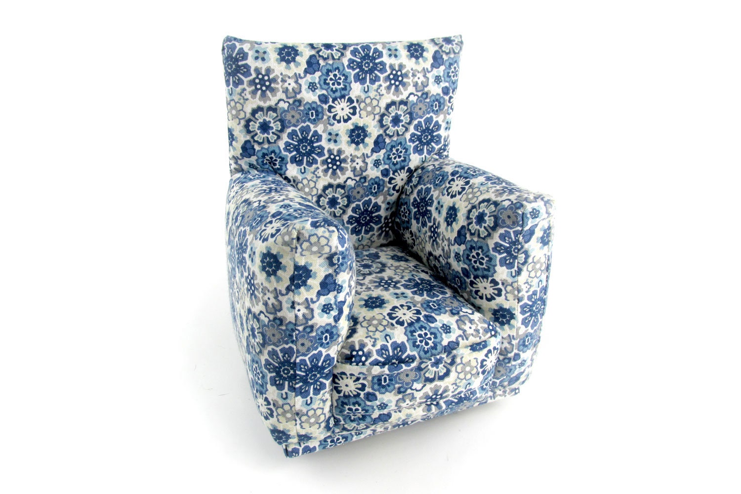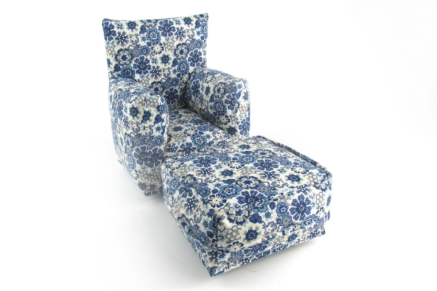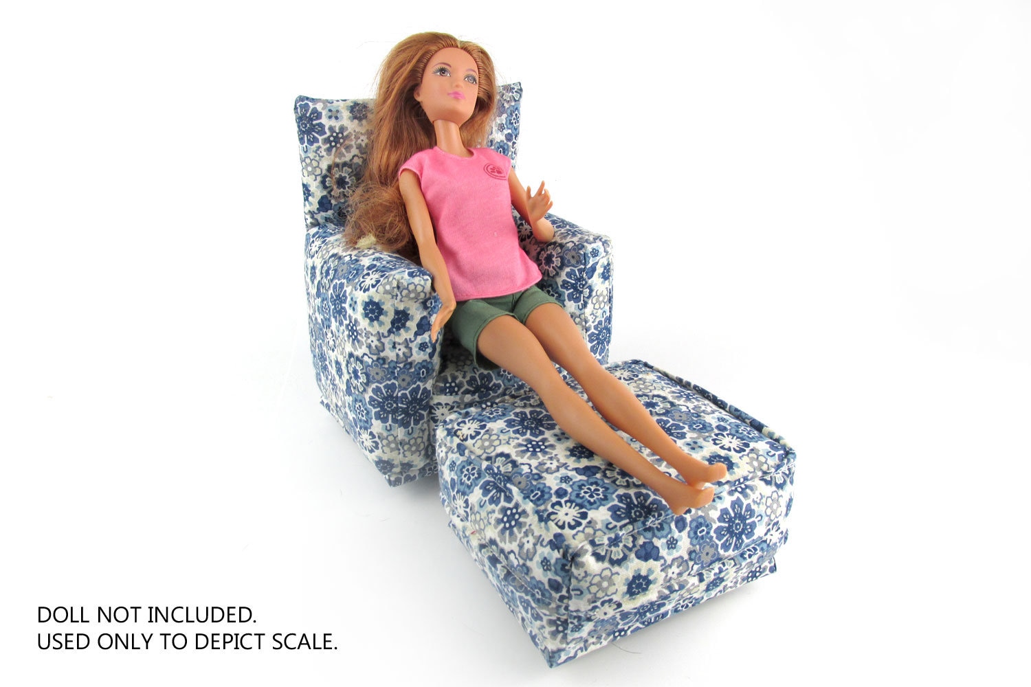 This set is handmade with sturdy wood frame construction. The Chair and Ottoman are padded and covered with a Blue, Gray and White flower print fabric. This Barbie doll Chair & Ottoman furniture play set will provide years of usage for your special child.