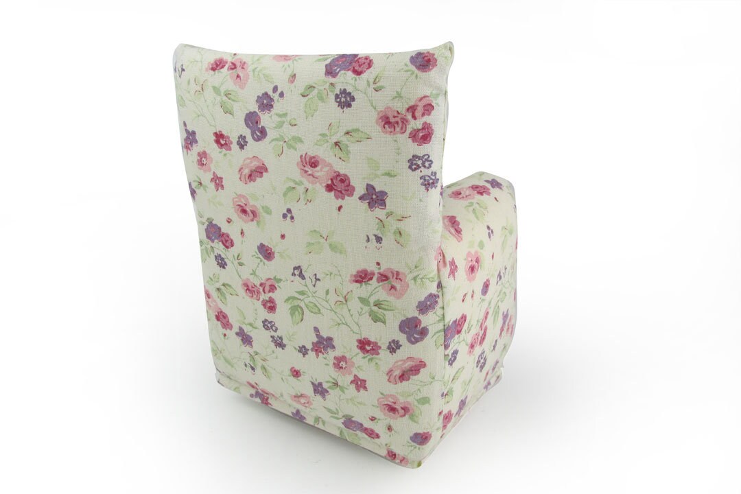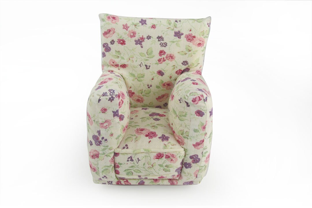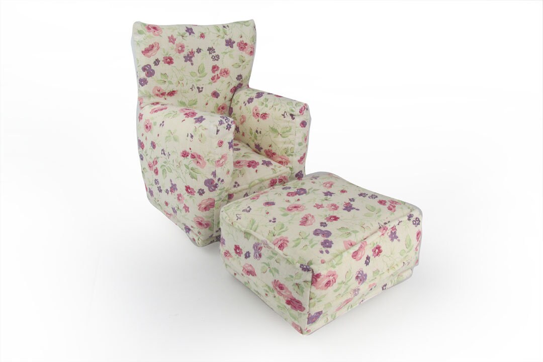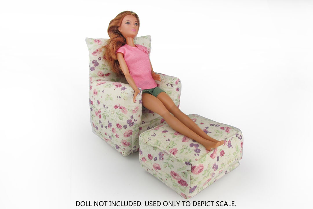 This set is handmade with sturdy wood frame construction. The Chair and Ottoman are padded and covered with a Cream, Purple, Green, Pink flower print fabric. This Barbie doll Chair & Ottoman furniture play set will provide years of usage for your special child.