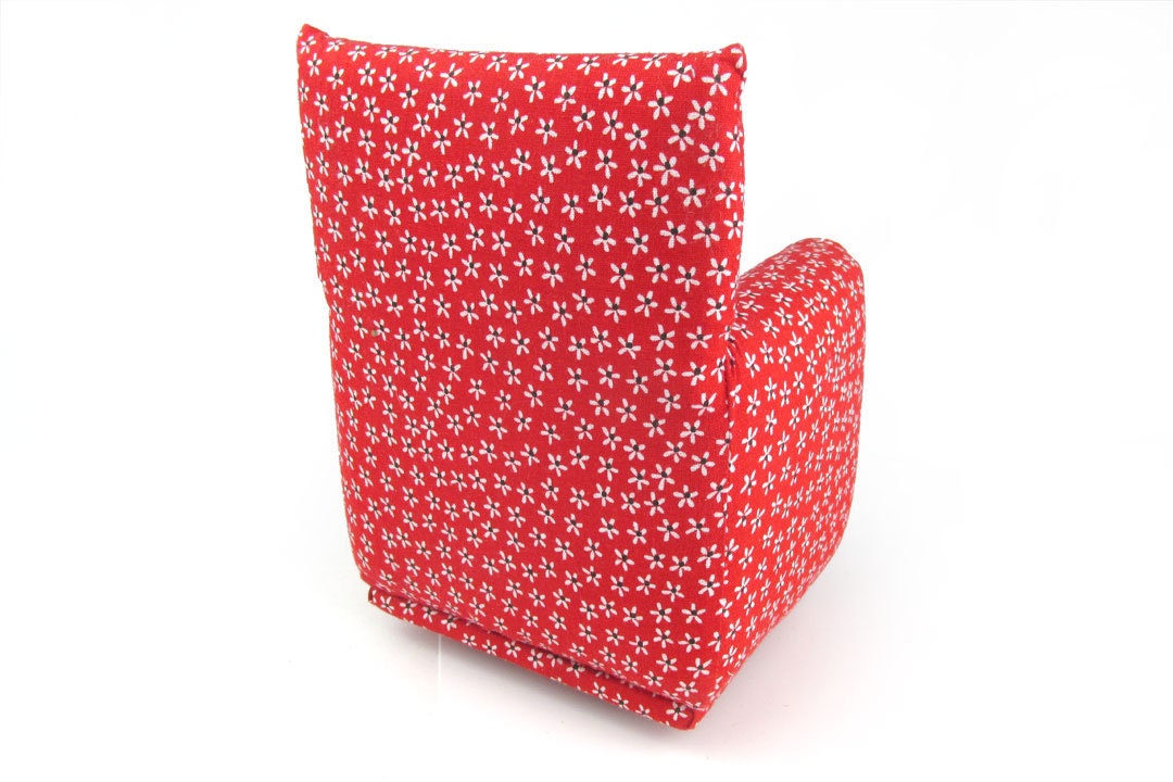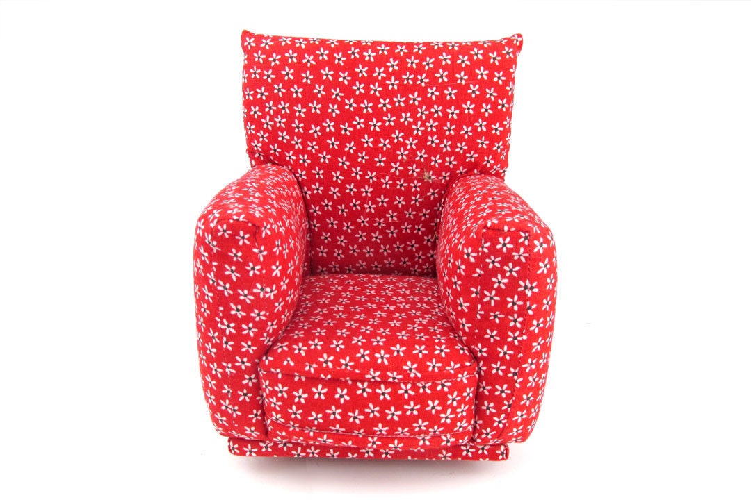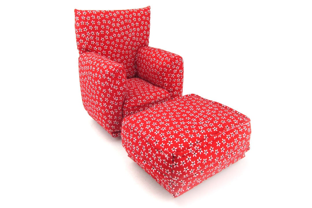 This set is handmade with sturdy wood frame construction. The Chair and Ottoman are padded and covered with a Red with tiny White and Black flower print fabric. This Barbie doll Chair & Ottoman furniture play set will provide years of usage for your special child.