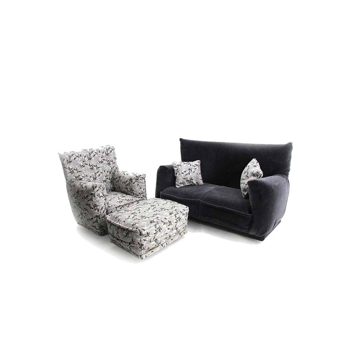 This set is handmade with sturdy wood frame construction. The Chair and Ottoman are padded and covered with a Light Gray with small White flower vine print and the sofa is covered with a Dark Gray solid fabric. Includes two matching pillows. This fashion doll furniture play set will provide years of usage for your special child.